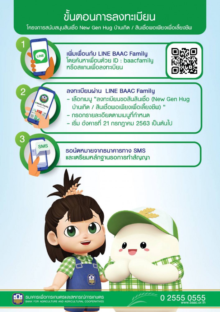 เพื่ออำนวยความสะดวกให้กับเกษตรกรลูกค้าผู้สนใจขอรับการสนับสนุนสินเชื่อ และดำเนินการตามหลักการเว้นระยะห่างทางสังคม (Social Distancing) ธ.ก.ส. ได้เปิดช่องทางลงทะเบียนขอสินเชื่อ New Gen Hug บ้านเกิดและสินเชื่อพอเพียงเพื่อเลี้ยงชีพ ผ่านทางLINE Official BAAC Familyโดยสามารถเพิ่มเพื่อนด้วยการสแกนQR Code หรือค้นหาเพื่อนด้วย ID : @baacfamilyโดยเมื่อเข้าสู่การลงทะเบียนตามช่องทางข้างต้นแล้วกดเลือกเมนู “ขอสินเชื่อ New Gen Hug บ้านเกิด/ พอเพียงเพื่อเลี้ยงชีพ” และกรอกรายละเอียดตามเมนูที่กำหนด