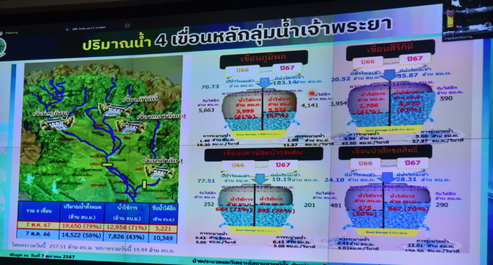 ด้านสถานการณ์น้ำใน 4 เขื่อนหลักลุ่มน้ำเจ้าพระยา (เขื่อนภูมิพล เขื่อนสิริกิติ์ เขื่อนแควน้อยบำรุงแดน และเขื่อนป่าสักชลสิทธิ์) มีปริมาณน้ำรวมกันทั้งสิ้นประมาณ 19,650 ล้าน ลบ.ม. (79% ของความจุอ่างฯ รวมกัน) ยังสามารถรองรับน้ำได้รวมกันอีกกว่า 5,221 ล้าน ลบ.ม. กระทรวงเกษตรฯ โดยกรมชลประทาน จึงได้บริหารจัดการน้ำที่ไหลมาจากทางตอนบน ด้วยการเก็บกักน้ำไว้ในอ่างเก็บน้ำให้ได้มากที่สุด พร้อมบริหารจัดการน้ำในพื้นที่ตอนกลาง ด้วยการหน่วงน้ำไว้ในพื้นที่ลุ่มต่ำและแก้มลิงธรรมชาติ ส่วนปริมาณน้ำที่เหลือจะไหลลงสู่ลุ่มเจ้าพระยา ที่สถานีวัดระดับน้ำ C.2 อ.เมือง จ.นครสวรรค์ คาดการณ์ว่าในช่วง 1 – 7 วันข้างหน้า ที่สถานีวัดน้ำ C.2 จ.นครสวรรค์ จะมีปริมาณน้ำไหลผ่านประมาณ 2,200 – 2,500 ลบ.ม./วินาที ส่งผลให้ระดับน้ำเหนือเขื่อนเจ้าพระยายกตัวสูงขึ้นตามไปด้วย