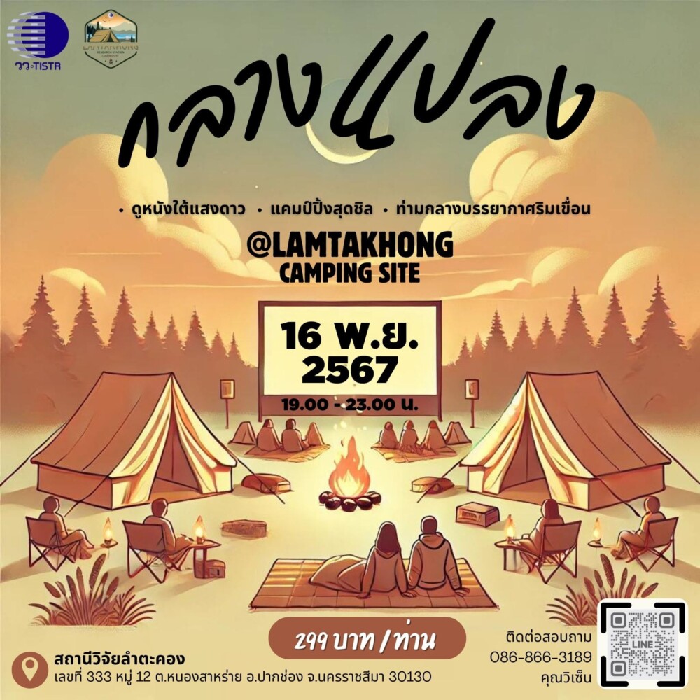 กระทรวงการอุดมศึกษา วิทยาศาสตร์ วิจัยและนวัตกรรม (อว.) สถาบันวิจัยวิทยาศาสตร์และเทคโนโลยีแห่งประเทศไทย (วว.) โดย สถานีวิจัยลำตะคอง อ.ปากช่อง จ.นครราชสีมา จัดกิจกรรม “ตั้งแคมป์ ดูหนัง” ในวันที่ 16 พฤศจิกายน 2567 กิจกรรมต้อนรับลมหนาว นั่งดูดาว ร่วมย้อนวันวาน…นอนเต็นท์…และดูหนังกลางแปลง ในเวลา 19.00 น. พร้อมแคมป์ปิ้งสุดชิล ในบรรยากาศริมเขื่อนลำตะคอง