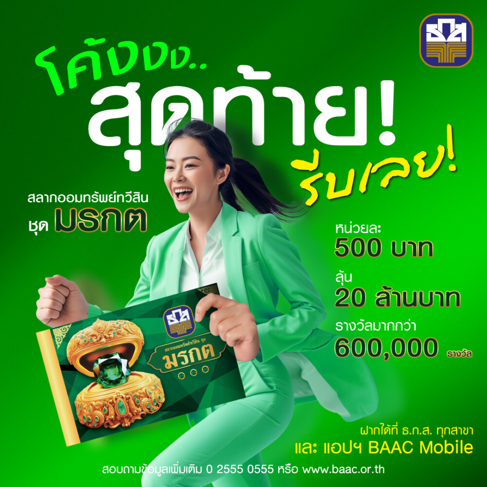ธ.ก.ส. เฮ! ยอดฝากสลากออมทรัพย์ทวีสิน ชุดมรกต ทะลุ 1 แสนล้านบาทเร็วเกินคาด โอกาสนี้ ขอขอบคุณลูกค้าทุกท่านที่ให้ความสนใจลุ้นรับโชคใหญ่ 20 ล้านบาทอย่างต่อเนื่อง พร้อมเปิดรับฝากอีก 5 หมื่นล้านบาทสุดท้าย ก่อนเต็มวงเงิน 150,000 ล้านบาท ฝากเลยวันนี้ ผ่านแอปพลิเคชัน BAAC Mobile หรือเคาน์เตอร์ ธ.ก.ส. ทุกสาขาทั่วประเทศ