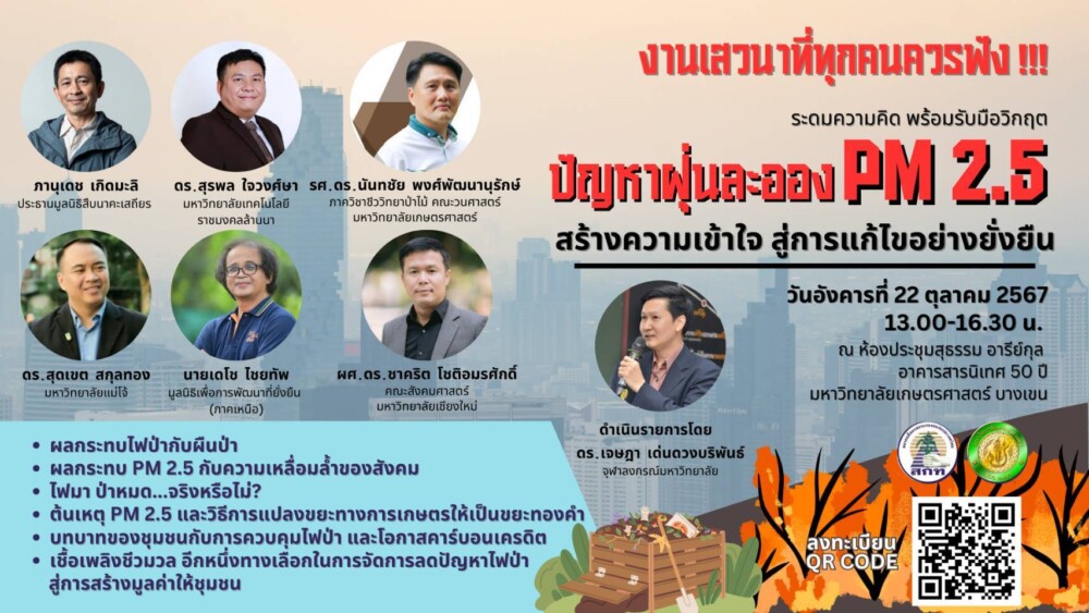 สมาคมสื่อมวลชนเกษตรแห่งประเทศไทย จึงร่วมกับ มหาวิทยาลัยเกษตรศาสตร์ จัดงานเสวนาขึ้น ในหัวข้อ “ปัญหาฝุ่นละออง” PM 2.5 สร้างความเข้าใจ สู่การแก้ไขอย่างยั่งยืน” ในวันอังคาร ที่ 22 ตลาคม 2567 เวลา 13.00. – 16.30 น. ณ ห้องประชุมสุธรรม อารียกุล อาคารสารนิเทศ 50 ปี ชั้น 1 มหาวิทยาลัยเกษตรศาสตร์ บางเขน โดยในงานเสวนาครั้งนี้ ได้รับเกียรติจากนักวิชาการที่มีความรู้จริงและมีความน่าเชื่อถือ