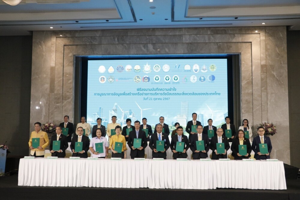 ดร.ประทีป วงศ์บัณฑิต รองผู้ว่าการวิจัยและพัฒนาด้านพัฒนาอย่างยั่งยืน สถาบันวิจัยวิทยาศาสตร์และเทคโนโลยีแห่งประเทศไทย (วว.) กระทรวงการอุดมศึกษา วิทยาศาสตร์ วิจัยและนวัตกรรม (อว.) พร้อมด้วย นายเฉลิมชัย จีระพันธุ์ ผู้อำนวยการ ศูนย์เชี่ยวชาญนวัตกรรมพลังงานสะอาดและสิ่งแวดล้อม วว. เข้าร่วมพิธีลงนามในบันทึกความเข้าใจการบูรณาการข้อมูลเพื่อสร้างเครือข่ายการบริหารดัชนีสมรรถนะสิ่งแวดล้อมของประเทศไทย ระหว่าง 25 หน่วยงาน