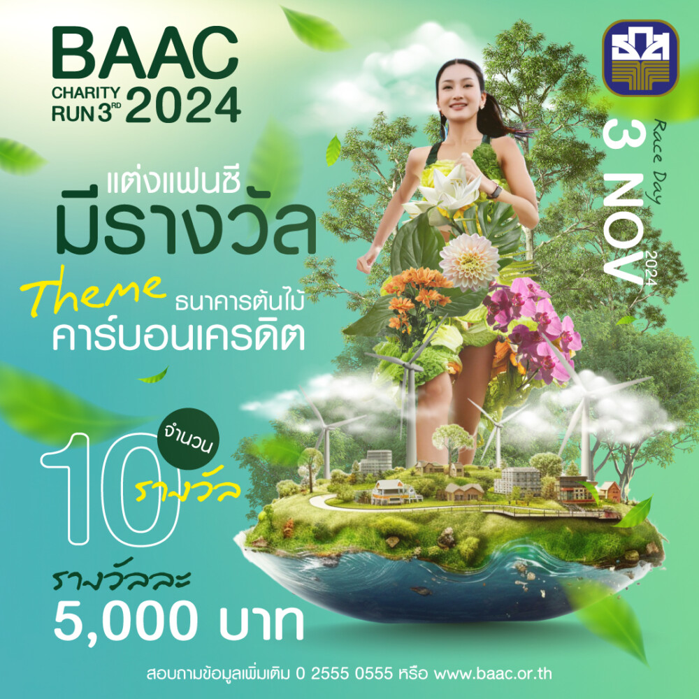 ธนาคารเพื่อการเกษตรและสหกรณ์การเกษตร(ธ.ก.ส.) ชวนผู้รักการวิ่งร่วมสนุกกับการแข่งขันแต่งกายแฟนซีภายใต้ธีม “ธนาคารต้นไม้สู่ BAAC Carbon Credit” ที่งานวิ่งครั้งใหญ่แห่งปี “BAAC Charity Run 3rd 2024″ในโอกาสวันสถาปนาธนาคารปีที่ 59 วันอาทิตย์ที่ 3 พฤศจิกายน 2567 ลุ้นรับรางวัลแฟนซีมูลค่า 5,000 บาท จำนวน 10 รางวัล มูลค่ารางวัลรวมถึง 50,000 บาท ผู้ที่สนใจแข่งขันลุ้นรางวัลแต่งกายแฟนซี สามารถแจ้งลงทะเบียนในวันงานก่อนการแข่งขัน 30 นาที ซึ่งผู้เข้าแข่งขันต้องวิ่งจนครบระยะวิ่งที่ลงสมัครก่อนเวลา Cut Off ทั้งประเภท Fun Run5 กม. และประเภท Mini Marathon 10.5 กม. แต่จะไม่พิจารณาลำดับในการเข้าเส้นชัย (เงื่อนไขอื่น ๆ ตามที่ธนาคารกำหนด)