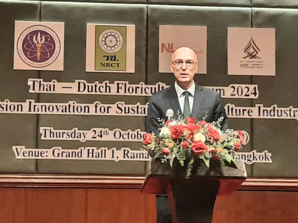 นายแร็มโก ฟัน ไวน์คาร์เดิน (H.E. Mr. Remco van Wijngaarden) เอกอัครราชทูตราชอาณาจักรเนเธอร์แลนด์ประจำราชอาณาจักรไทย กล่าวว่า ในโลกที่เรายกย่องความสวยงามและความสุขจากดอกไม้ เราต้องตระหนักถึงความท้าทายที่ภาคอุตสาหกรรมไม้ดอกไม้ประดับกำลังเผชิญ เนื่องจากการเปลี่ยนแปลงสภาพภูมิอากาศและผลกระทบต่อสิ่งแวดล้อม วันนี้ เราได้เห็นว่า ประเทศไทยและเนเธอร์แลนด์ ได้นำความรู้ นวัตกรรม และความเชี่ยวชาญมาร่วมแบ่งปันเทคโนโลยีและแนวปฏิบัติที่ดีเพื่อความยั่งยืน ความร่วมมือนี้เป็นกุญแจสำคัญในการเสริมสร้างความแข็งแกร่งและยั่งยืนให้กับอุตสาหกรรมไม้ดอกไม้ประดับเพื่ออนาคต