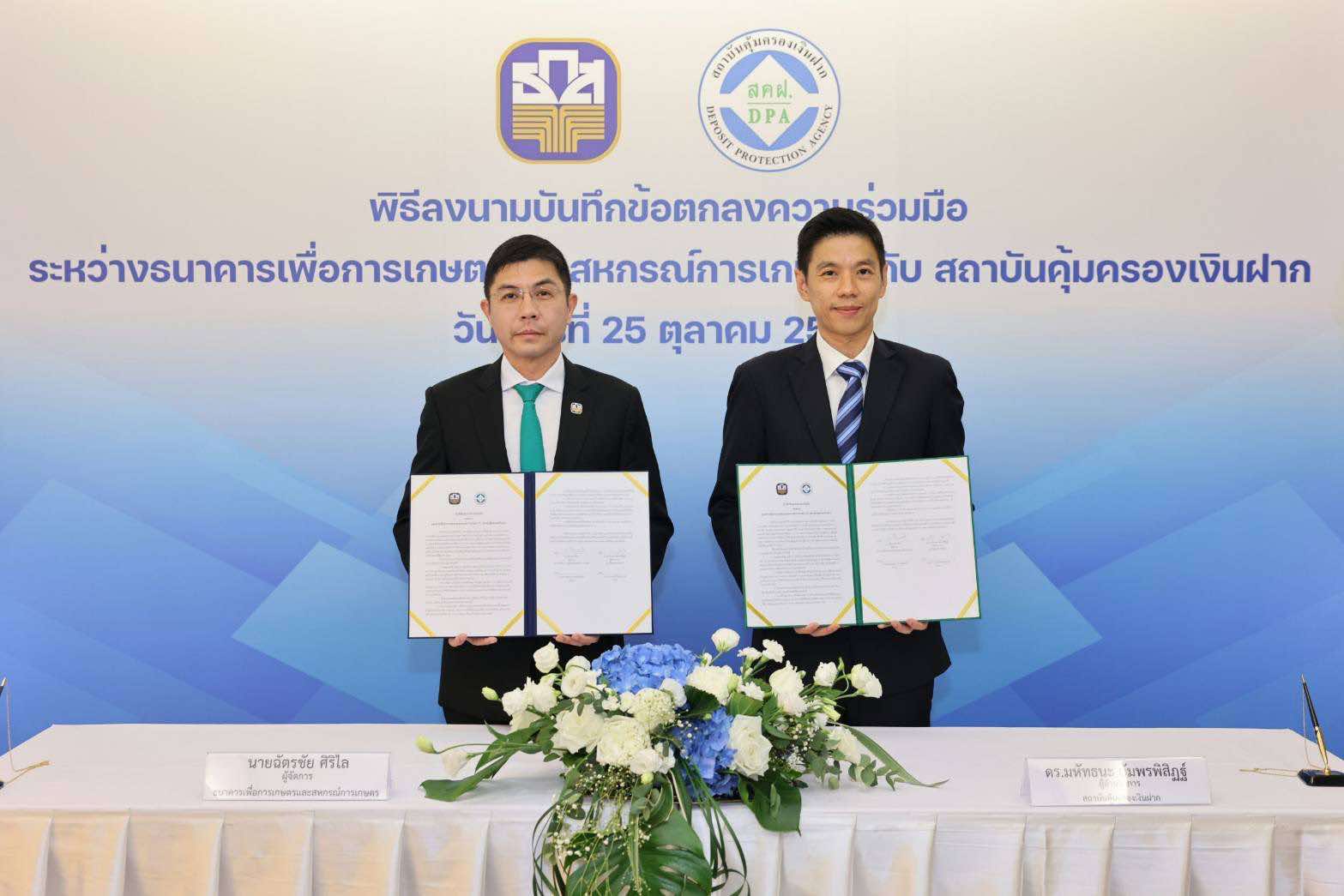 นายฉัตรชัย ศิริไล ผู้จัดการธนาคารเพื่อการเกษตรและสหกรณ์การเกษตร (ธ.ก.ส.) และ ดร. มหัทธนะ อัมพรพิสิฏฐ์ ผู้อำนวยการสถาบันคุ้มครองเงินฝาก (สคฝ.) ร่วมลงนามบันทึกข้อตกลงความร่วมมือสนับสนุนการให้ความรู้เกี่ยวกับการคุ้มครองเงินฝากแก่ประชาชนและการเตรียมความพร้อมในการจ่ายเงินฝากให้แก่ผู้ฝาก ระหว่าง ธ.ก.ส. และ สถาบันคุ้มครองเงินฝาก เพื่อยกระดับความรู้ด้านการคุ้มครองเงินฝากให้กับกลุ่มเป้าหมายได้แก่ ลูกค้าธนาคาร เกษตรกร และประชาชนด้วยการเผยแพร่ข้อมูลผ่านช่องทางและวิธีการที่เหมาะสม เพิ่มขีดความสามารถในการเข้าถึงกลุ่มเป้าหมาย รวมถึงการเตรียมความพร้อมในการจ่ายคืนเงินฝากให้แก่ผู้ฝากเงิน ซึ่ง ธ.ก.ส. จะสนับสนุนการรับการยื่นคำขอต่างๆ และจ่ายคืนเงินฝากให้แก่ผู้ฝากให้สะดวก รวดเร็วมากยิ่งขึ้น