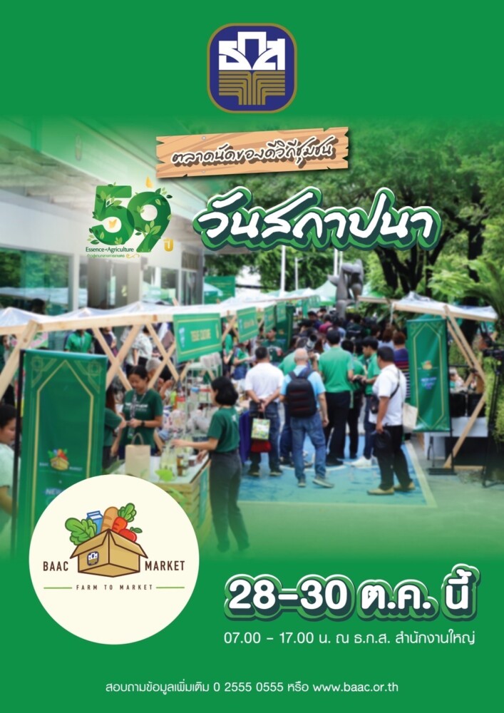นายไพศาล หงษ์ทอง รองผู้จัดการธนาคารเพื่อการเกษตรและสหกรณ์การเกษตร (ธ.ก.ส.) เปิดเผยว่าในโอกาสครบรอบวันสถาปนา ธ.ก.ส. ปีที่ 59 และขับเคลื่อนภารกิจการเป็นแกนกลางเกษตร (Essence of Agriculture) ในด้านการพัฒนาตลาด เพื่อยกระดับรายได้ให้เกษตรกร ธนาคารจึงได้จัดงานตลาดนัดของดีวิถีชุมชน ภายใต้ธีม “Western Farm Fair” ที่ยกผลผลิตสินค้าดัง เจ้าเด็ด จากเกษตรกรลูกค้า ธ.ก.ส. ในพื้นที่ภาคตะวันตกมาไว้ในงานครั้งนี้ ระหว่างวันที่ 28-30 ตุลาคม 2567 ณ บริเวณด้านหน้า ธ.ก.ส. สำนักงานใหญ่ กรุงเทพมหานคร