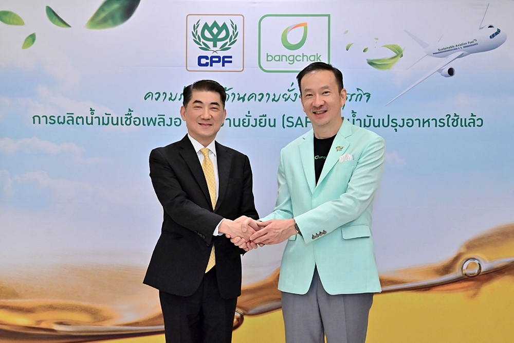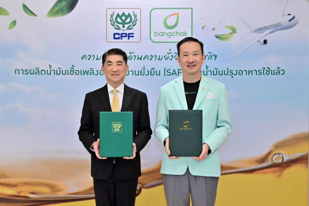 ภายใต้ความร่วมมือนี้ บางจากฯ และซีพีเอฟ จะร่วมกันบริหารจัดการการน้ำมั นปรุงอาหารใช้แล้ว รวมถึงไขมันต่าง ๆ จากธุรกิจผลิตอาหารและไขมั นจากบ่อบำบัดน้ำเสียของซีพี เอฟและบริษัทในเครือ เพื่อผลิตเป็นน้ำมันเชื้อเพลิ งอากาศยานยั่งยืน (Sustainable Aviation Fuel – SAF) โดยบีเอสจีเอฟ