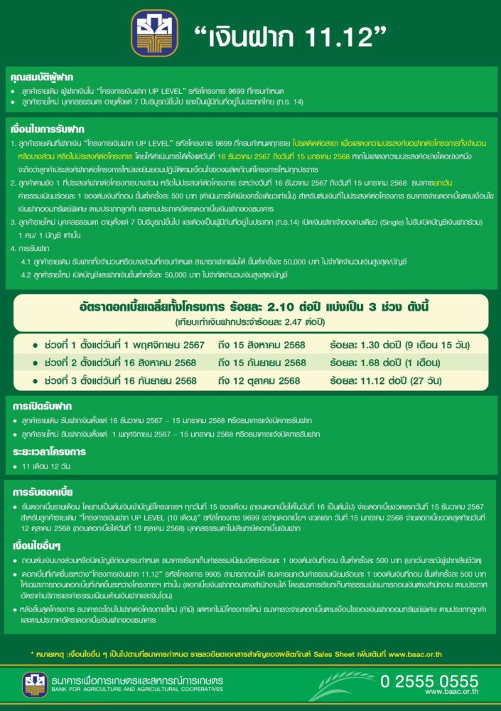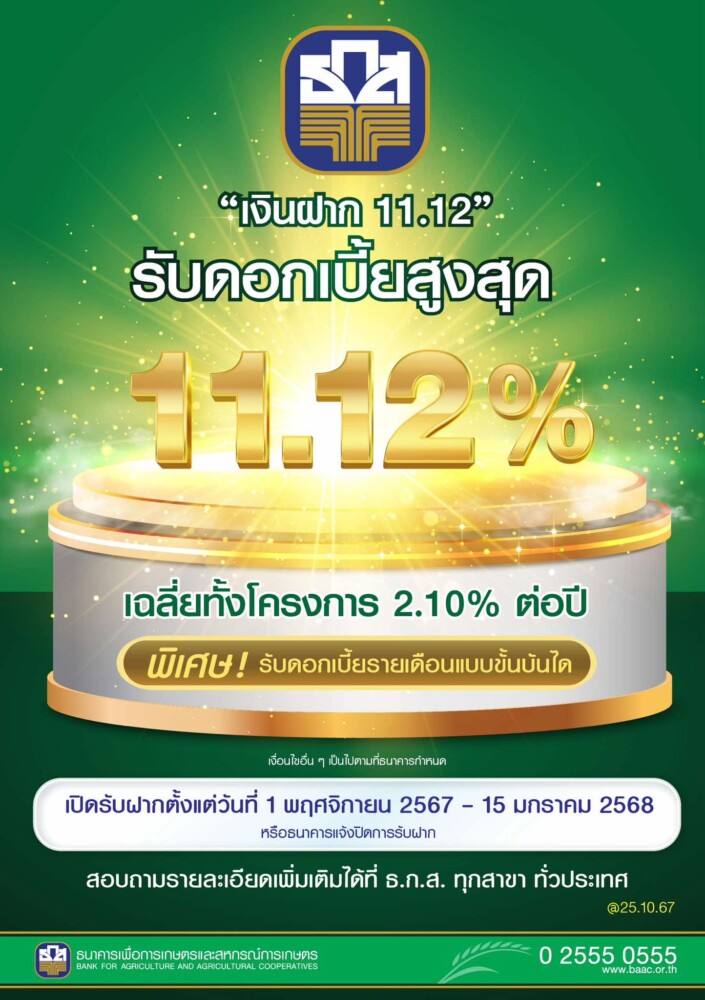 ธ.ก.ส. ปิดรับจองเงินฝากออมทรัพย์พิเศษ “เงินฝากเขียวชอุ่ม” หลังมีลูกค้าจองสิทธิ์เต็มวงเงินเรียบร้อยแล้ว และส่งเสริมการออมต่อเนื่องด้วยการเปิดตัวผลิตภัณฑ์ใหม่ล่าสุด “เงินฝาก 11.12” รับดอกเบี้ยแบบขั้นบันไดสูงสุดถึงร้อยละ 11.12 ต่อปี เพียงฝากขั้นต่ำครั้งละ 50,000 บาท โดยไม่จำกัดวงเงินฝากสูงสุดเป็นระยะเวลา 11 เดือน 12 วัน เปิดรับฝากแล้วตั้งแต่วันที่ 1 พฤศจิกายน 2567 ถึง 15 มกราคม 2568 ที่ ธ.ก.ส. ทุกสาขาทั่วประเทศ