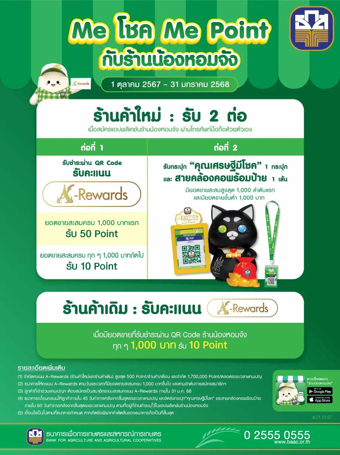 ธนาคารเพื่อการเกษตรและสหกรณ์การเกษตร (ธ.ก.ส.) จัดแคมเปญ “Me โชค Me Point กับร้านน้องหอมจัง” เพื่อส่งเสริมให้ร้านค้าสมัครใช้บริการ แอปพลิเคชันร้านน้องหอมจัง รับชำระค่าสินค้าและบริการผ่าน QR Code โดยร้านค้าใหม่ เมื่อสมัครใช้บริการแอปพลิเคชันดังกล่าวผ่านมือถือด้วยตนเอง เมื่อมียอดขายสะสมครบ 1,000 บาทแรก จะได้รับคะแนน A-Rewards 50 Point และยอดขายสะสมครบทุกๆ 1,000 บาทถัดไป ได้รับคะแนน A-Rewards 10 Point
