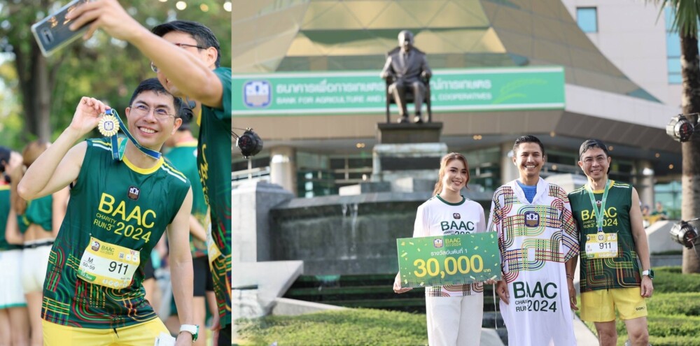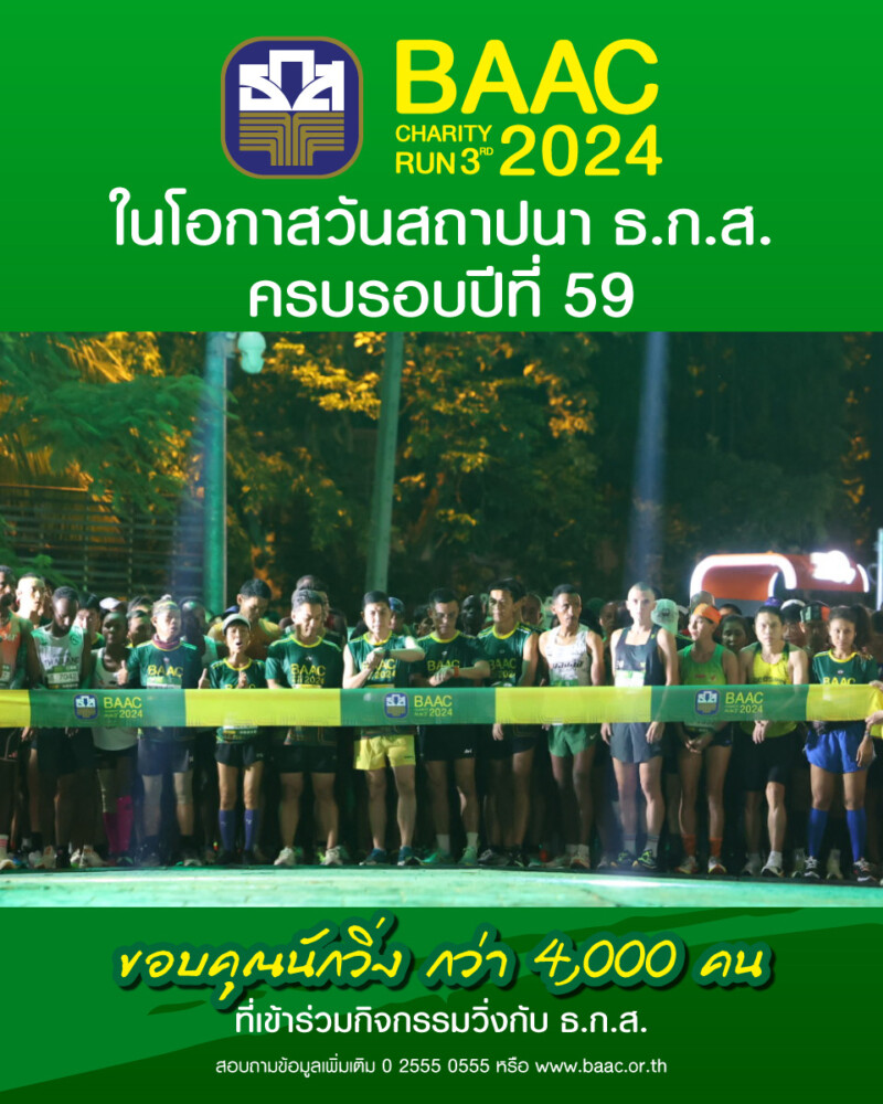 ธ.ก.ส. ประกาศความสำเร็จของการจัดงานวิ่งครั้งใหญ่แห่งปี BAAC Charity Run 3rd 2024 เนื่องในโอกาสครบรอบวันสถาปนา ธ.ก.ส. ปีที่ 59 วันที่ 1 พฤศจิกายน 2567 ซึ่งมีนักวิ่งทั้งชาวไทยและชาวต่างชาติ เข้าร่วมการแข่งขันกว่า4,000คน เพื่อชิงรางวัลรวม มูลค่ากว่า 1 ล้านบาท โดยผลการแข่งขันปรากฏว่า นักวิ่งประเภท Mini Marathon ระยะ10.5 กิโลเมตร จากประเทศอธิโอเปีย เข้าเส้นชัยเป็นอันดับ 1 ด้วยเวลาเพียง 30.52 นาที คว้ารางวัล Overall มูลค่า1 แสนบาทไปครอง โดยมีนางภัทรพร วรทรัพย์ กรรมการธนาคารเพื่อการเกษตรและสหกรณ์การเกษตร (ธ.ก.ส.) ให้เกียรติเป็นประธานในพิธีมอบรางวัล