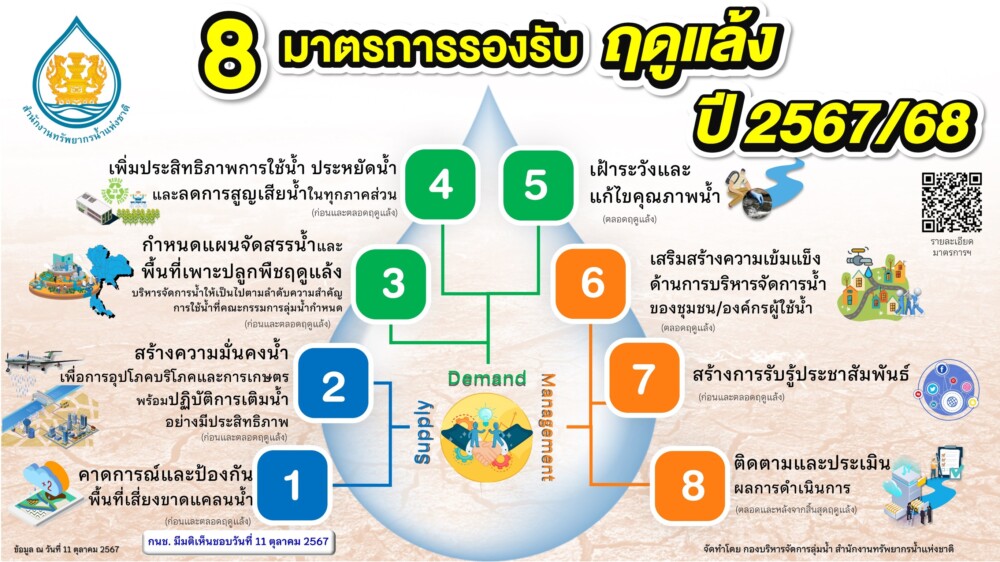 ดังนั้นกรมชลประทาน ได้วางแผนจัดสรรน้ำในช่วงฤดูแล้งปี 2567/68 มี 8 มาตรการ ตั้งแต่วันที่ 1 พฤศจิกายน 2567 – 30 เมษายน 2568 จากปริมาณน้ำต้นทุน ณ วันที่ 1 พฤศจิกายน 2567 โดยมีแผนจัดสรรน้ำในฤดูแล้งทั้งประเทศจำนวน 29,170 ล้าน ลบ.ม. ตามลำดับความสำคัญดังนี้ เพื่อการเกษตรฤดูแล้ง 16,555 ล้าน ลบ.ม. เพื่อการอุปโภค-บริโภค 3,050 ล้าน ลบ.ม. อุตสาหกรรม 800 ล้าน ลบ.ม. รักษาระบบนิเวศและอื่นๆ 8,765 ล้าน ลบ.ม. และสำรองน้ำไว้ต้นฤดูฝนปี 2568 อีก 15,080 ล้าน ลบ.ม. พื้นที่คาดการณ์ปลูกข้าวนาปรังทั้งประเทศรวม 10.01 ล้านไร่