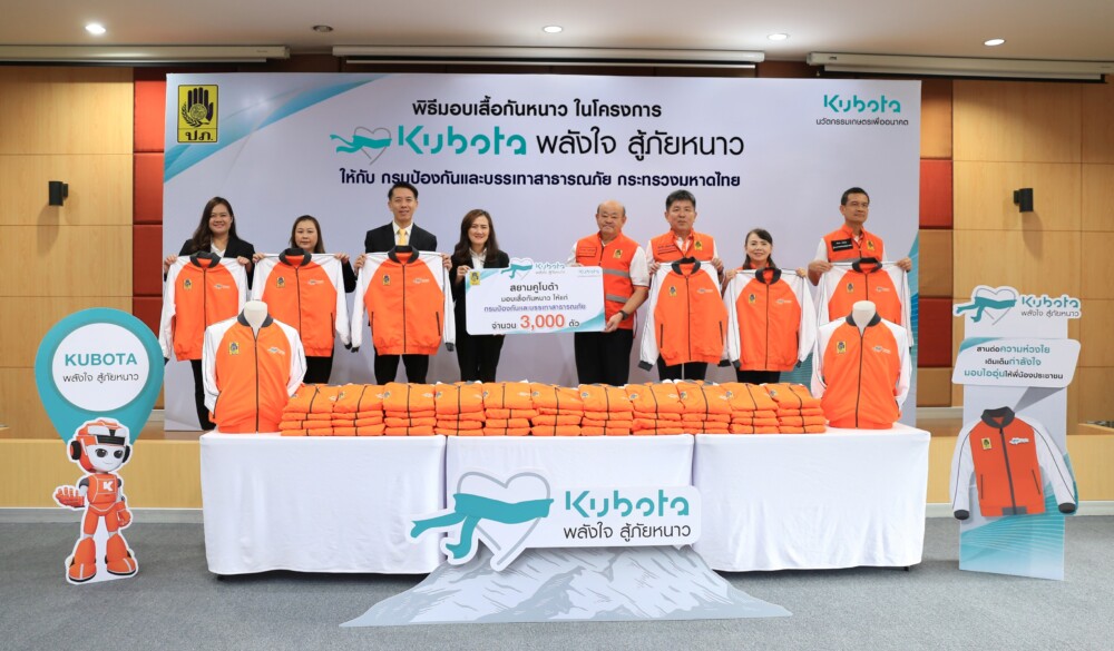บริษัทสยามคูโบต้าคอร์ปอเรชั่น จำกัด โดย นางวราภรณ์ โอสถาพันธุ์ กรรมการรองผู้จัดการใหญ่อาวุโส (คนที่ 4 จากซ้าย) มอบเสื้อกันหนาว จำนวน 3,000 ตัว ในโครงการ “คูโบต้า พลังใจสู้ภัยหนาว ปีที่ 25” ให้แก่กรมป้องกันและบรรเทาสาธารณภัย โดยมี นายไชยวัฒน์ จุนถิระพงศ์ อธิบดีกรมป้องกันและบรรเทาสาธารณภัย (คนที่ 5 จากซ้าย) ให้เกียรติรับมอบ เพื่อส่งต่อความอบอุ่นไปยังประชาชนที่ได้รับความเดือดร้อนจากภัยหนาวในพื้นที่จังหวัดเชียงราย พะเยา และเลย ณ กรมป้องกันและบรรเทาสาธารณภัย เมื่อเร็วๆ นี้