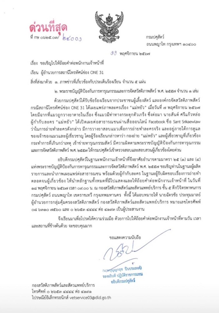 กรมปศุสัตว์เรียกเจ้าของสัตว์ ผู้ที่เกี่ยวข้องมาให้ถ้อยคํา หรือส่งเอกสาร หลักฐานที่เกี่ยวข้องมาเพื่อชี้แจงกรณีมีการร้องเรียนว่ามีซีรีส์ดัง ได้ออกอากาศ มีฉากที่ “แมวถูกวางยา” เป็นแมวดำมีอาการ ตัวกระตุก ตัวเกร็ง พร้อมทั้งมีการขย้อนอาหารออกมา เผยอาจเข้าข่ายทารุณกรรมสัตว์หรือไม่ ล่าวสุดมอบให้กองสวัสดิภาพสัตว์ฯ ส่งหนังสือถึงสถานีโทรทัศน์ช่องดัง เพื่อให้ถ้อยคำต่อพนักงานเจ้าหน้าที่ ในวันที่ 18 พฤศจิกายนนี้ เพื่อบังคับใช้กฎหมายที่เกี่ยวข้องอย่างตรงไปตรงมา และแจ้งผลการตรวจสอบข้อเท็จจริงต่อสาธารณชนต่อไป