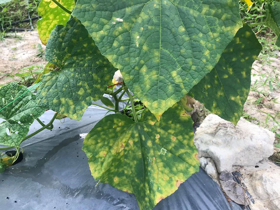 สำหรับโรคราน้ำค้างในพืชตระกูลแตง เช่น แตงกวา แตงร้าน แตงโม แตงไทย เมล่อน แคนตาลูป ซูกินี ฟักทอง ฟักเขียว ฟักแม้ว มะระจีน และบวบ เกิดจากเชื้อรา Pseudoperonospora cubensis มักพบอาการของโรคบนใบที่อยู่บริเวณด้านล่างของต้นก่อน แล้วขยายลุกลามไปยังใบที่อยู่ด้านบน อาการเริ่มแรกบนใบปรากฏแผลฉ่ำน้ำ แผลจะขยายตามกรอบของเส้นใบย่อย ทำให้เห็นเป็นรูปเหลี่ยมเล็ก ๆ ต่อมาแผลเปลี่ยนเป็นสีเหลือง ในตอนเช้าที่สภาพอากาศมีความชื้นสูงจะพบเส้นใยของเชื้อรา