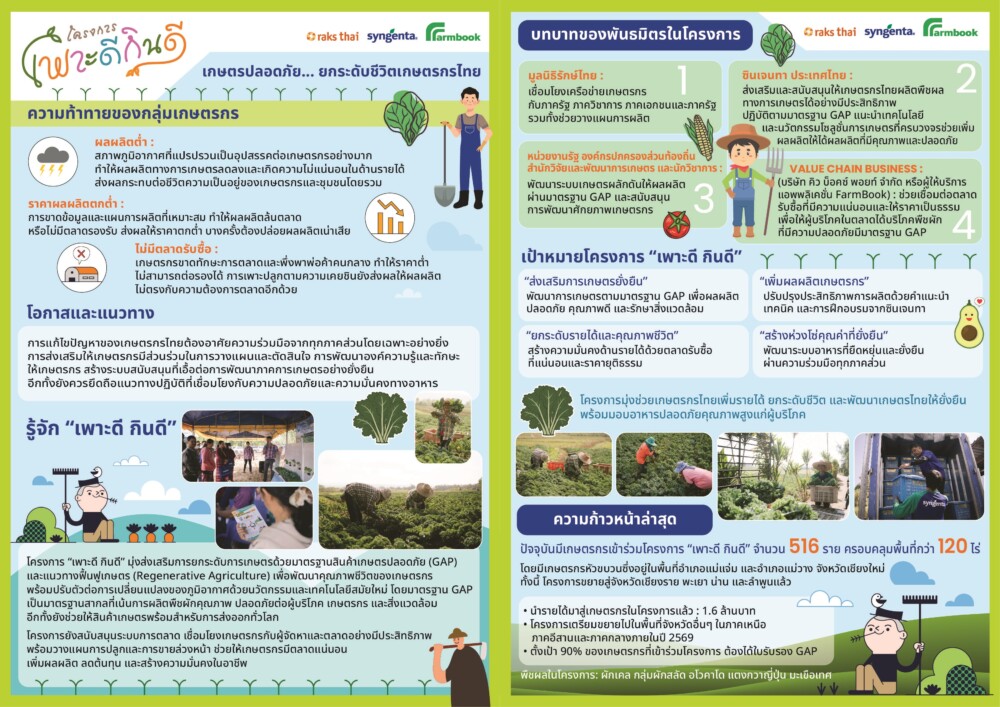 ซินเจนทา-เกษตรกรปลื้ม ครบ 1 ปี ผนึกกำลังพันธมิตร ผลักดันเกษตรกรไทยผลิตพืชผักอาหารปลอดภัยอย่างยั่งยืน ภายใต้การปฏิบัติตามมาตรฐานสินค้าเกษตรปลอดภัย GAP (Good Agricultural Practices) ที่มีตลาดรับซื้อรองรับผลผลิต ช่วยยกระดับคุณภาพชีวิตของเกษตรกรให้มีรายได้ที่มั่นคง ผ่านโครงการ ‘เพาะดี กินดี’ เผยปัจจุบันมีเกษตรกรเข้าร่วมโครงการแล้ว 516 ราย ครอบคลุมพื้นที่เพาะปลูกกว่า 120 ไร่ และสามารถเพิ่มผลผลิตได้มากกว่า 2 เท่าตัว
