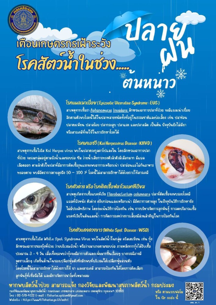 กรมประมง แจ้งเตือนเกษตรกรผู้เพาะเลี้ยงสัตว์น้ำเฝ้าระวัง 4 โรคสัตว์น้ำที่มักพบได้บ่อยในช่วงเปลี่ยนฤดูกาล หรือช่วงปลายฝนต้นหนาว จากสภาพอากาศที่แปรปรวน ฝนตกสลับอากาศร้อนในบางพื้นที่ของประเทศไทย ส่งผลให้เกิดการเปลี่ยนแปลงอุณหภูมิของน้ำอย่างรวดเร็ว กระทบทั้งสัตว์น้ำที่เลี้ยงในบ่อและกระชังในแหล่งน้ำเปิด ย้ำเกษตรกรผู้เพาะเลี้ยงสัตว์น้ำให้ดูแลอย่างใกล้ชิดและปฏิบัติตามคำแนะนำของกรมประมงอย่างเคร่งครัด