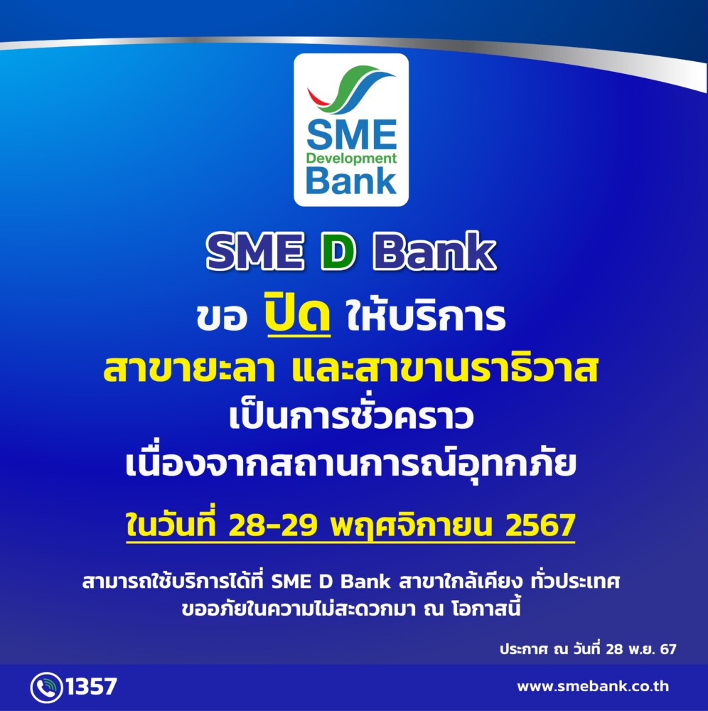 [banner id="21835"]รายงานจากธนาคารพัฒนาวิสาหกิจขนาดกลางและขนาดย่อมแห่งประเทศไทย (ธพว.) หรือ SME D Bank แจ้งมาว่า ทางธนาคารฯ จะทำการปิดให้การบริการ สาขายะลา และ สาขานราธิวาส เป็นการชั่วคราว ในวันที่ 28-29 พฤศจิกายน 2567 เนื่องจากเกิดสถานการณ์อุทกภัยในพื้นที่ ทั้งนี้ สามารถใช้บริการได้ที่ SME D Bank สาขาใกล้เคียง ขออภัยในความไม่สะดวกมา ณ โอกาสนี้
