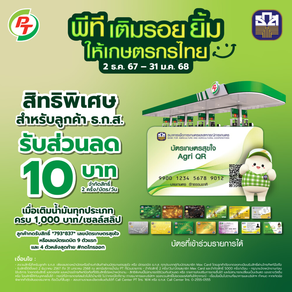 ธนาคารเพื่อการเกษตรและสหกรณ์การเกษตร (ธ.ก.ส.) ร่วมกับ บริษัท แมกซ์ โซลูชัน เซอร์วิส จำกัด จัดแคมเปญสุดพิเศษ เพื่อช่วยแบ่งเบาภาระค่าใช้จ่ายให้ลูกค้า ธ.ก.ส. ผู้ถือบัตรเกษตรสุขใจ หรือบัตรเดบิต ธ.ก.ส.ทุกประเภท คู่กับบัตรสมาชิก Max Card รับสิทธิพิเศษเมื่อเติมน้ำมัน และชำระค่าน้ำมันทุกประเภทตั้งแต่ 1,000 บาทขึ้นไป/เซลล์สลิป รับส่วนลดทันที 10 บาท ณ สถานีบริการน้ำมัน PT ทุกสาขาทั่วประเทศ