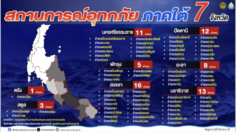 โดยเฉพาะในพื้นที่ 3 จังหวัดชายแดนภาคใต้จะยังคงมีฝนตกและในช่วงวันที่ 4 – 6 ธ.ค.67 พื้นที่ 3 จังหวัดชายแดนภาคใต้จะได้รับอิทธิพลจากระดับน้ำทะเลหนุนสูง ส่งผลต่อการระบายน้ำออกสู่ทะเล ปัจจุบันมีพื้นที่ที่ประสบอุทกภัย7 หวัด ได้แก่ นครศรีธรรมราช สตูล พัทลุง สงขลา ยะลา ปัตตานี และนราธิวาสสำหรับปริมาณน้ำในลำน้ำพบว่าจะมีปริมาณน้ำล้นในหลายพื้นที่ได้แก่ แม่น้ำปัตตานี แม่น้ำสายบุรี แม่น้ำโก-ลก และคลองอู่ตะเภาจากข้อมูลคาดการณ์ฝนตกหนักมากกว่า 200 มม. ในพื้นที่ภาคใต้ พบว่ามีพื้นที่เสี่ยงเฝ้าระวังดินโคลนถล่มเพิ่มขึ้นจาก 5 จังหวัดชายแดนใต้ โดยมีจังหวัดเพิ่มเติม ได้แก่ สุราษฎร์ธานี นครศรีธรรมราช ตรัง และพัทลุง จึงได้มีประกาศแจ้งเตือนเฝ้าระวังภัยแผ่นดินถล่มและน้ำป่าไหลหลาก ในช่วง 29 พ.ย. – 4 ธ.ค. นี้