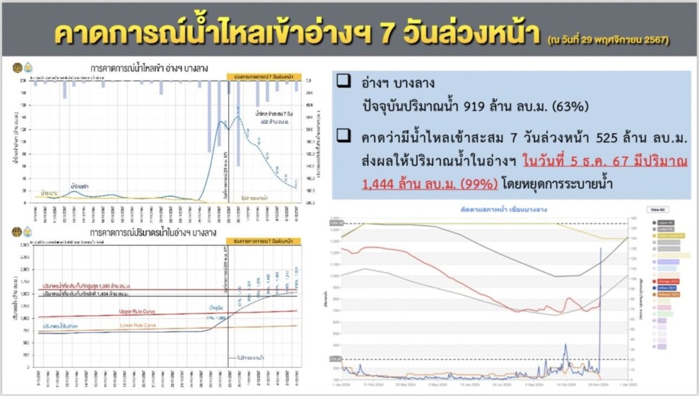 อย่างไรก็ ที่ผ่านมาได้มีการแจ้งเตือนและอพยพประชาชนได้อย่างทันท่วงที สำหรับสถานการณ์ปริมาณน้ำอ่างเก็บน้ำเขื่อนบางลางปัจจุบันมีปริมาณน้ำ 919 ล้าน ลบ.ม. (63%) จึงได้มีการงดการระบายน้ำตั้งแต่วันที่ 27 พ.ย. 67 แต่จากการคาดการณ์ 7 วันข้างหน้าจะมีปริมาณน้ำไหลเข้ามาในเขื่อนบางลาง 500 ล้าน ลบ.ม. ส่งผลให้มีปริมาณน้ำเพิ่มสูงขึ้นเกือบเต็มของความจุเก็บกัก ซึ่งส่งผลต่อความมั่นคงและความปลอดภัยของเขื่อน ทำให้ต้องมีการเพิ่มการระบายน้ำจึงได้มีการระบายน้ำจากเขื่อนบางลาง โดยประเมินอัตราการระบายน้ำไม่เกิน 16 ล้าน ลบ.ม./วัน หรือ 185ลบ.ม./วินาที เพื่อควบคุมปริมาณน้ำที่สถานี X40A ที่กำลังลดลงไม่ให้สูงเกินระดับสูงสุดที่เคยเกิดในช่วงวันที่ 28 พ.ย. 67 ที่ผ่านมา (1,517 ลบ.ม./วินาที หรือ +18.97 ม.รทก) และคำนึงถึงน้ำฝนที่ตกลงมาด้านท้ายเขื่อนเพื่อนำเสนอผลดังกล่าวต่อคณะกรรมการลุ่มน้ำต่อไป