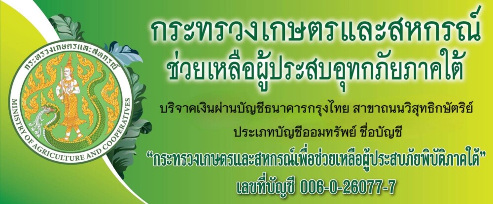 กระทรวงเกษตรและสหกรณ์ ขอเชิญชวนร่วมเป็นส่วนหนึ่งในการช่วยเหลือพี่น้องผู้ประสบอุทกภัยภาคใต้ปี 2567 โดยสามารถบริจาคเงินผ่านบัญชีธนาคารกรุงไทย สาขาถนนวิสุทธิกษัตริย์ ประเภทบัญชีออมทรัพย์ ชื่อบัญชี “กระทรวงเกษตรและสหกรณ์ เพื่อช่วยเหลือผู้ประสบภัยพิบัติภาคใต้” เลขที่บัญชี 006-0-26077-7