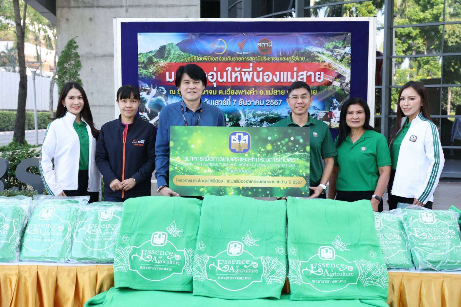 นายฉัตรชัย ศิริไล ผู้จัดการธนาคารเพื่อการเกษตรและสหกรณ์การเกษตร (ธ.ก.ส.) มอบเงินสมทบทุนพร้อมด้วยผ้าห่มกันหนาว และผลิตภัณฑ์ข้าวหอมมะลิพร้อมทานตรา “อุ่นอิ่ม” ให้กับไทยพีบีเอส นำไปส่งต่อเพื่อช่วยเหลือประชาชน รวมถึงพี่น้องเกษตรกรที่ประสบภัยหนาวในโครงการ “มอบไออุ่นให้พี่น้องแม่สายจ.เชียงราย” พร้อมเป็นกำลังใจให้แม่สายกลับเข้าบ้าน