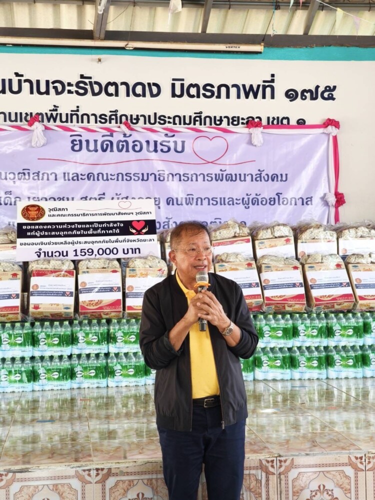 นอกจากนี้ คณะวุฒิสภายังได้มอบเงินที่สมาชิกวุฒิสภาได้ร่วมกันบริจาค เป็นจำนวน 159,000 บาท ให้กับนางบัดรียะ สะโตะ ประธานสตรีจังหวัดยะลา และประธานสตรีภาคใต้ เพื่อนำไปให้ความช่วยเหลือแก่ผู้ประสบภัยในพื้นที่ พร้อมมอบถุงยังชีพ และของจำเป็นในการดำรงชีพ อีกจำนวน 100 ชุด รวมถึงสิ่งของอุปโภค บริโภคให้กับกลุ่มเปราะบาง อาทิ ข้าวสาร อาหารแห้ง และไข่ไก่ จำนวน 10,000 ฟอง เป็นต้น