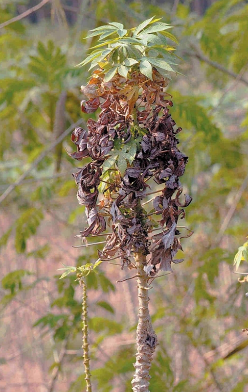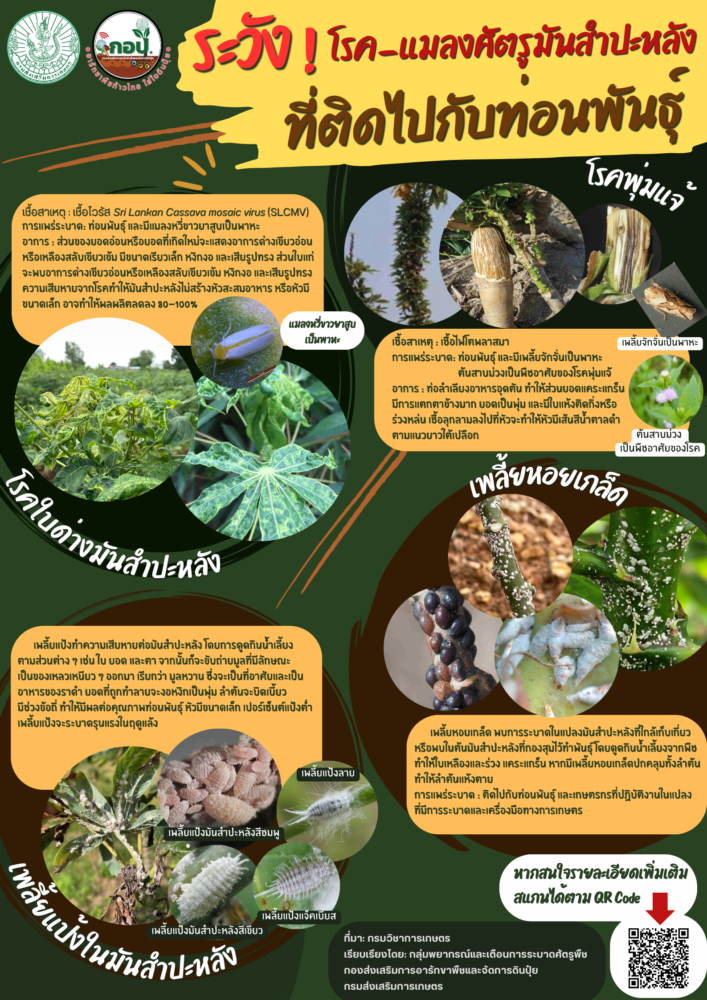 กรมส่งเสริมการเกษตรเตือนเกษตรกรผู้ปลูกมันสำปะหลังในทุกภาคของประเทศไทย เฝ้าระวังการระบาดโรคและแมลงที่ติดไปกับท่อนพันธุ์มันสำปะหลัง เผยปัจจุบันอยู่ในช่วงปลูกมันสำปะหลังปลายฝนหรือฤดูแล้ง จะพบกับ 2 โรค” ใบด่าง-โรคพุ่มแจ้” กับ 2 แมลง “เพลี้ยแป้ง- เพลี้ยหอย”
