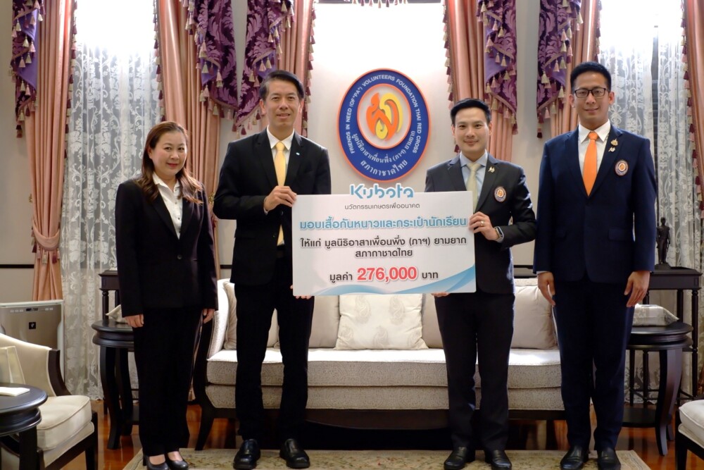 บริษัทสยามคูโบต้าคอร์ปอเรชั่น จำกัด นำโดย นายรัชกฤต สงวนชีวิน ผู้จัดการฝ่าย Sustainability Development (ลำดับที่ 2 จากซ้าย) มอบเสื้อกันหนาวและกระเป๋านักเรียน มูลค่า 276,000 บาท ให้แก่มูลนิธิอาสาเพื่อนพึ่ง (ภาฯ) ยามยาก สภากาชาดไทย โดยมี นายฐิติวัฒน์ ว่องวรรณกุล กรรมการและผู้จัดการมูลนิธิอาสาเพื่อนพึ่ง (ภาฯ) ยามยาก สภากาชาดไทย (ลำดับที่ 3 จากซ้าย) เป็นผู้รับมอบ เพื่อเป็นการสานต่อความช่วยเหลือให้แก่ผู้ประสบภัยจากสถานการณ์น้ำท่วมอย่างรุนแรง ในพื้นที่อำเภอแม่สาย จังหวัดเชียงราย ณ มูลนิธิอาสาเพื่อนพึ่ง (ภาฯ) ยามยาก เมื่อเร็วๆ นี้