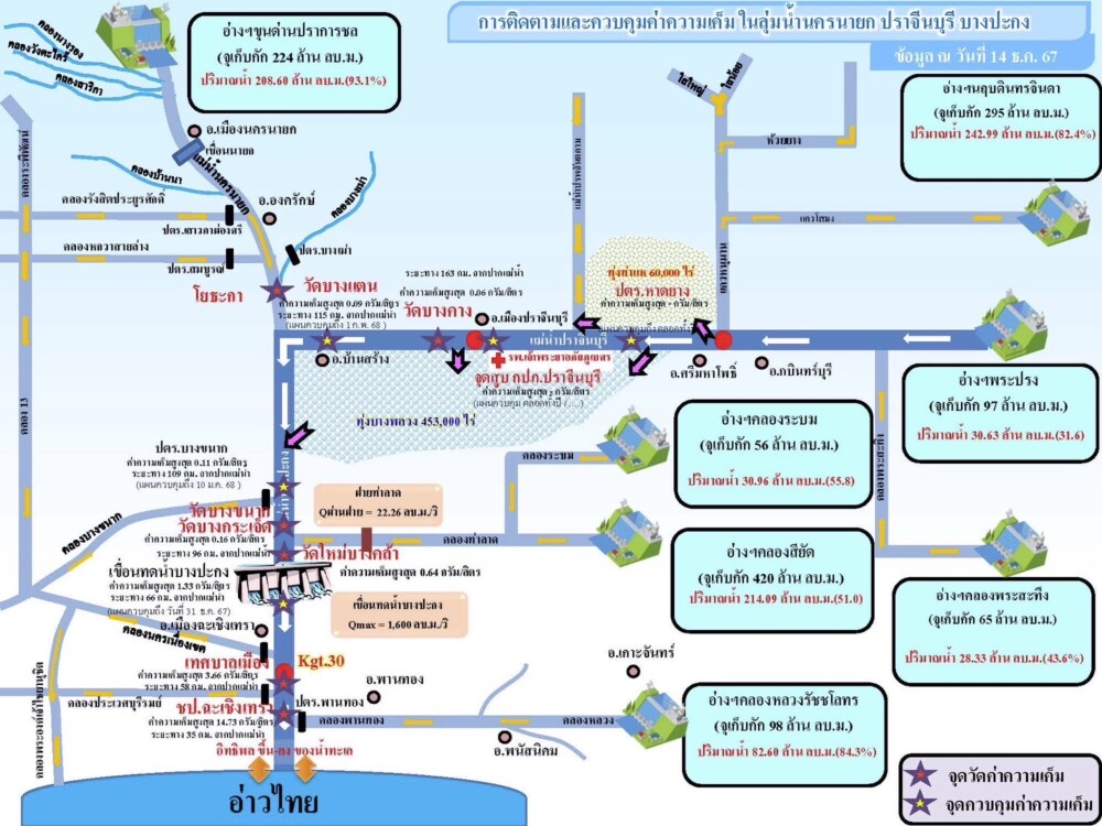 รายงานจากสำนักงานชลประทานที่ 9 แจ้งว่า ได้ปรับแผนการระบายน้ำจากเขื่อนขุนด่านปราการชล จ.นครนายก เสริมน้ำที่ระบายมาจากอ่างเก็บน้ําคลองสียัดและอ่างเก็บน้ําคลองระบม จ.ฉะเชิงเทรา ที่ระบายก่อนหน้านี้แล้ว เพื่อควบคุมความเค็มในลุ่มน้ำบางปะกง เนื่องจากระดับน้ำในพื้นที่ตอนบนของลุ่มน้ำบางปะกง โดยเฉพาะในแม่น้ำปราจีนบุรี ได้ลดลงอย่างต่อเนื่อง ประกอบกับในช่วงวันที่ 15-17 ธ.ค. 67 กรมอุทกศาสตร์ กองทัพเรือ คาดการณ์ว่าน้ำทะเลจะหนุนสูงสุด ทำให้ค่าความเค็มมีแนวโน้มที่จะรุกตัวเข้ามาถึงจุดควบคุมที่ 1 บริเวณเขื่อนบางปะกง (ระยะทาง 66 กิโลเมตร จากปากแม่น้ำบางปะกง) ซึ่งเร็วกว่าที่คาดการณ์ไว้ก่อนหน้านี้