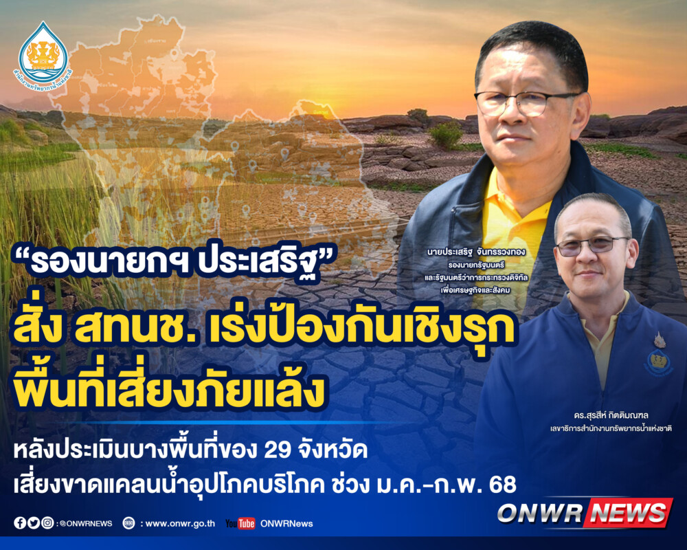 “รองนายกฯ ประเสริฐ” สั่ง สทนช. เร่งป้องกันพื้นที่เสี่ยงภัยแล้งเชิงรุกทั่วประเทศ หลังประเมิน 29 จังหวัด พื้นที่บางส่วนเสี่ยงขาดแคลนน้ำอุปโภคบริโภคช่วงเดือน ม.ค.-ก.พ. 68 กำชับลงพื้นที่บูรณาการหน่วยงานเร่งขับเคลื่อนมาตรการรองรับฤดูแล้ง ปี 67/68 พร้อมชู “ต.คลองไผ่ อ.สีคิ้ว จ.นครราชสีมา” เป็นโมเดลต้นแบบการป้องกันภัยแล้งเชิงรุก