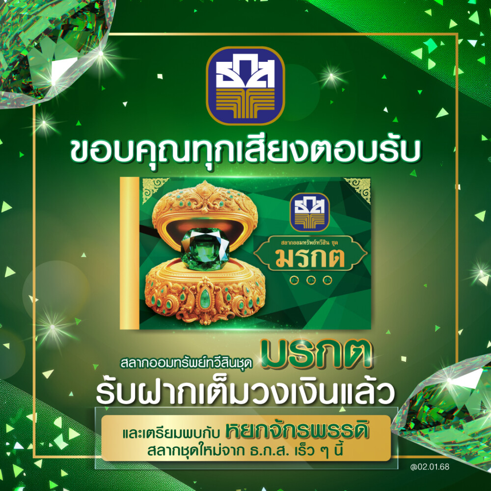 เต็มวงเงินแล้ว! ยอดฝากสลากออมทรัพย์ทวีสิน ชุดมรกต ธ.ก.ส. ขอขอบคุณลูกค้าทุกท่านที่ให้ความสนใจอย่างล้นหลามจนยอดฝากเต็ม 150,000 ล้านบาทแล้ว เตรียมพบกับการลุ้นโชคครั้งใหม่ยิ่งใหญ่กว่าเดิมกับสลากออมทรัพย์ ธ.ก.ส. ชุดหยกจักรพรรดิ วันที่ 17 กุมภาพันธ์ 2568 ที่มาพร้อมโอกาสลุ้นรางวัลใหญ่และผลตอบแทนสูง รอติดตามข่าวสารผลิตภัณฑ์เพิ่มเติมได้ที่ www.baac.or.th Facebook : ธกส BAAC Thailand และ LINE OA : BAAC Family เร็ว ๆ นี้