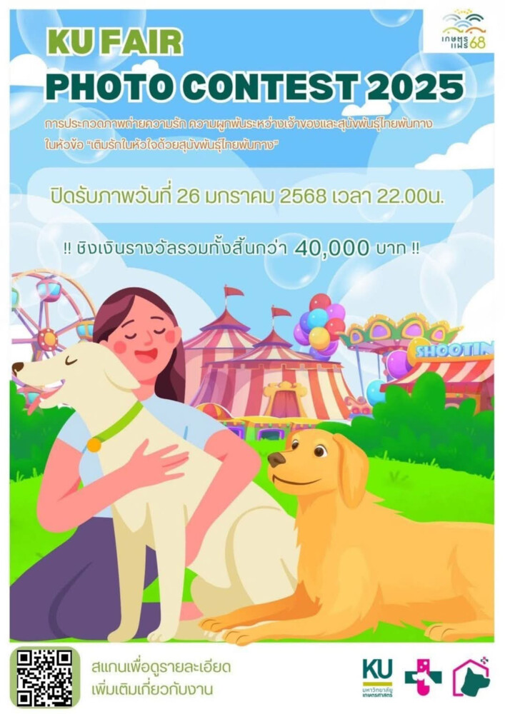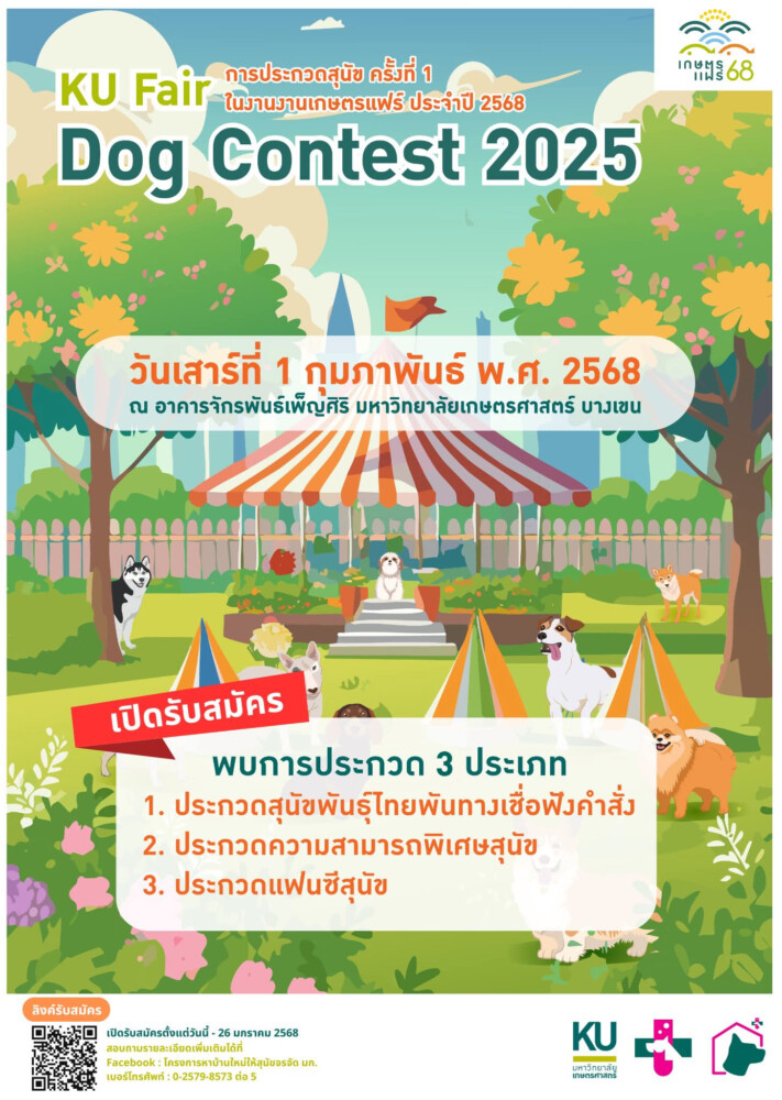 ใกล้เข้ามาแล้ว!! “งานเกษตรแฟร์ ประจำปี 2568 ” จะมีขึ้นระหว่างวันที่ 31 มกราคม – 8 กุมภาพันธ์ 2568 รวม 9 วัน ที่มมหาวิทยาลัยเกษตรศาสตร์ บางเขน ปีนี้เน้นเผยแพร่ผลงานวิจัยและนวัตกรรมของ มก.สู่สังคม และเปิดโอกาสอาจารย์-นิสิตได้ฝึกการทำงานจริงเกิดการเรียนรู้ทุกรูปแบบเสมือนห้องปฏิบัติการภาคสนาม พร้อมช่วยเหลือเกษตรกร ผู้ประกอบการ กลุ่มวิสาหกิจชุมชน มูลนิธิฯ ให้มีช่องทางจำหน่ายสินค้าและผลิตภัณฑ์ทางการเกษตร สินค้าแปรรูป สินค้าอุปโภคบริโภคด้วย ในโฮกาสนี้ขอเชิญชมและส่งสุนัขเข้าประกวดกิจกรรม “Dog Contest 2025” รวมถึงการประกวดภาพถ่ายในหัวข้อ “เติมรักในหัวใจ ด้วยสุนัขพันธุ์ไทยพันทาง” ชิงรางวัล 40,000 บาท