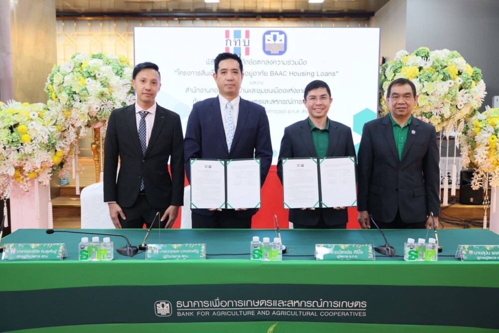 นายฉัตรชัย ศิริไล ผู้จัดการธนาคารเพื่อการเกษตรและสหกรณ์การเกษตร (ธ.ก.ส.) พร้อมด้วย นายเบญจพล นาคประเสริฐ ผู้อำนวยการสำนักงานกองทุนหมู่บ้านและชุมชนเมืองแห่งชาติ (สทบ.) ร่วมลงนามบันทึกข้อตกลงความร่วมมือโครงการสินเชื่อเคหะเพื่อที่อยู่อาศัยระหว่าง ธ.ก.ส. และสำนักงานกองทุนหมู่บ้านและชุมชนเมืองแห่งชาติ ซึ่งถือเป็นหน่วยงาน ที่มีบทบาทในการส่งเสริมชุมชนให้เกิดความเข้มแข็งด้านเศรษฐกิจและ การพัฒนาคุณภาพชีวิต