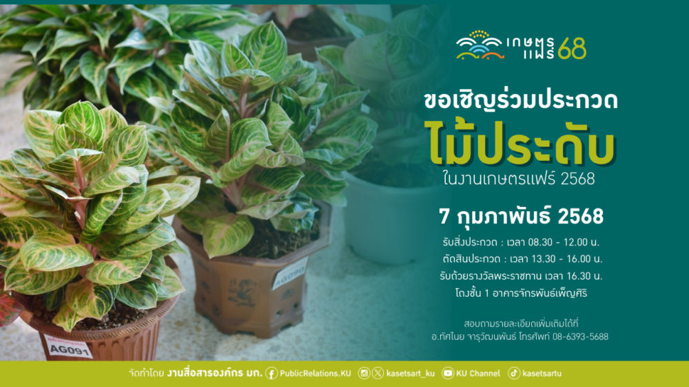 มหาวิทยาลัยเกษตรศาสตร์ ร่วมกับ ชมรมผู้พัฒนาไม้ประดับ 2000 ขอเชิญผู้สนใจเข้าชมและส่งไม้ประดับเข้าประกวด ในงานเกษตรแฟร์ ประจำปี 2568 ในวันศุกร์ที่ 7 กุมภาพันธ์ 2568 ณ บริเวณโถงด้านล่างอาคารจักรพันธ์เพ็ญศิริ มหาวิทยาลัยเกษตรศาสตร์ บางเขน กรุงเทพฯ