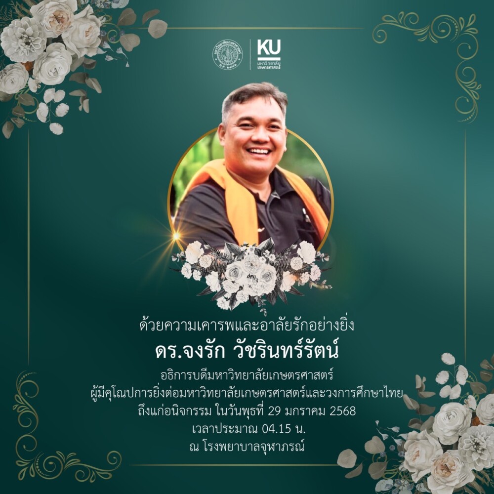ราวกับต้นนนทรีย์ต้นใหญ่ล้มลงในช่วงปลายฤดูหนาวที่กำลังจะมีงานยิ่งใหญ่ประจำปี “เกษตรแฟร์ ปี 2568 “ ณ มหาวิทยาลัยเกษตรศาสตร์ บางเขน กรุงเทพฯ ท่ามกลางการตกตลึงและเศร้าสลดของชาว มก.ที่ทราบข่าว การจากไปที่ไม่มีวันกลับของผู้บริหารสูงสุดของมหาวิทยาลัยเกษตรศาสตร์ “ดร.จงรัก วัชรินทร์รัตน์” ในฐานะอธิการบดี