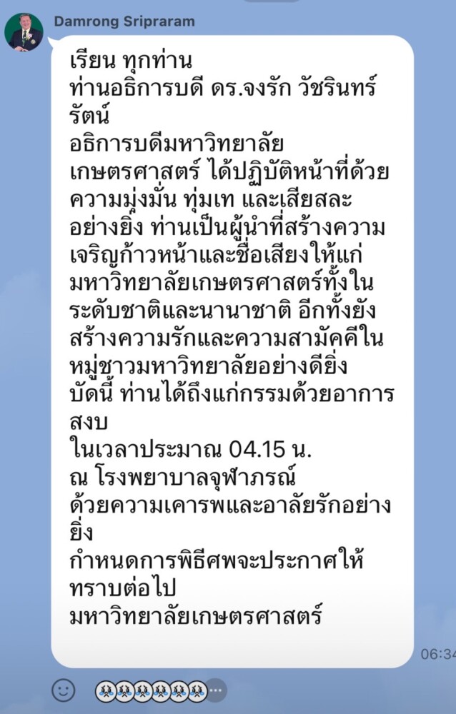 กลับจากการออกกำลังกายช่วงเช้า เปิดโทรศัพท์มือใจหายวาบ หลังจากที่ได้เห็นข้อความบนเฟสบุ๊ตส่วนตัวของ “ดร.ดำรงค์ ศรีพระราม” รองอธิการบดีฝ่ายบริหารและความเป็นกลางทางคาร์บอน มหาวิทยาลัยเกษตรศาสตร์ พร้อมภาพถ่าย ระบุว่า