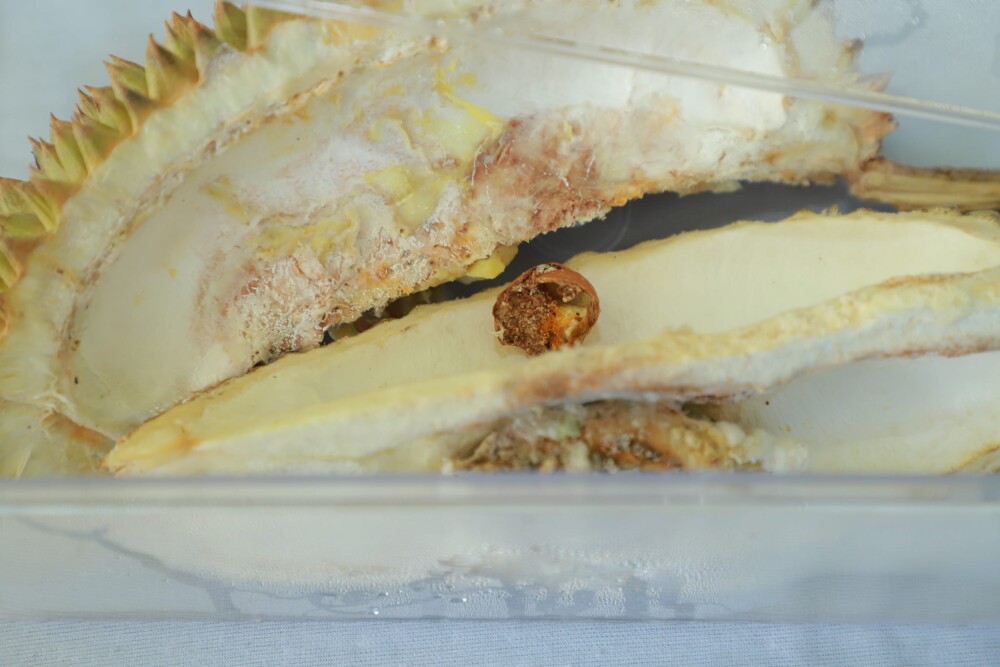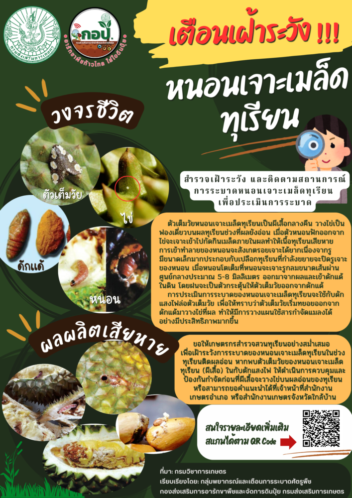 กรมส่งเสริมการเกษตร เตือนผู้ปลูกทุเรียนในทุกภูมิภาค เฝ้าระวังการระบาดของหนอนเจาะเมล็ดทุเรียน ระบุเป็นเเป็นผีเสื้อกลางคืน วางไข่ได้ 100 – 200 ฟองต่อตัว มีถิ่นกำเนิดอยู่ในประเทศมาเลเซียแล้วระบาดเข้ามาทางภาคใต้ของประเทศไทย แนะเกษตรกรให้สำรวจสวนทุเรียนอย่างสม่ำเสมอหากพบตัวเต็มวัยหนอนเจาะเมล็ดทุเรียนในช้กับดักแสงไฟให้ใช้ 5 วิธีเพื่อควบคุมและป้องกันกำจัดก่อนเกิดการระบาด