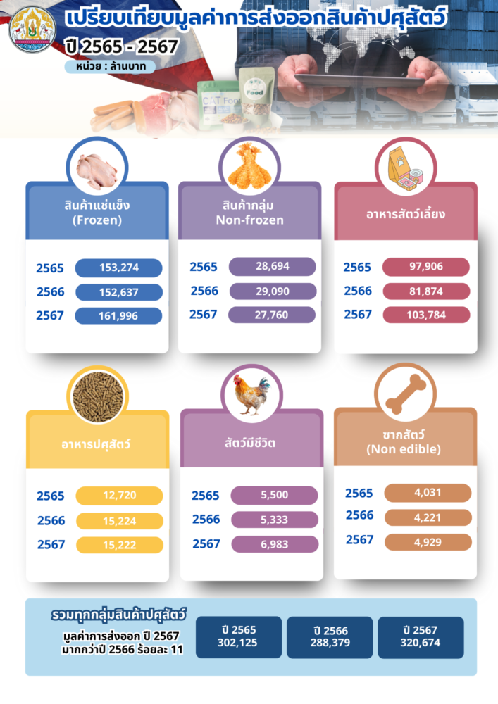 กรมปศุสัตว์ lสรุปผลการส่งออกสินค้าปศุสัตว์ของไทยปี 2567 มูลค่ากว่า 320,674 ล้านบาท สูงที่สุดในประวัติกาล เผยเติบโตขึ้นจากปี 2566 ร้อยละ 11 ที่มีมูลค่าการส่งออก 288,379 ล้านบาท สะท้อนถึงศักยภาพของสินค้าเกษตรไทยในตลาดโลก คาดปีนี้การส่งออกสินค้าปศุสัตว์ยังสามารถเติบโตได้อย่างต่อเนื่อง