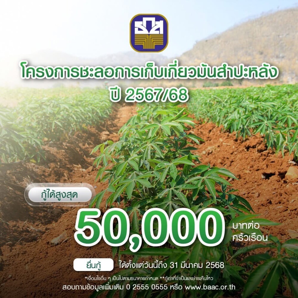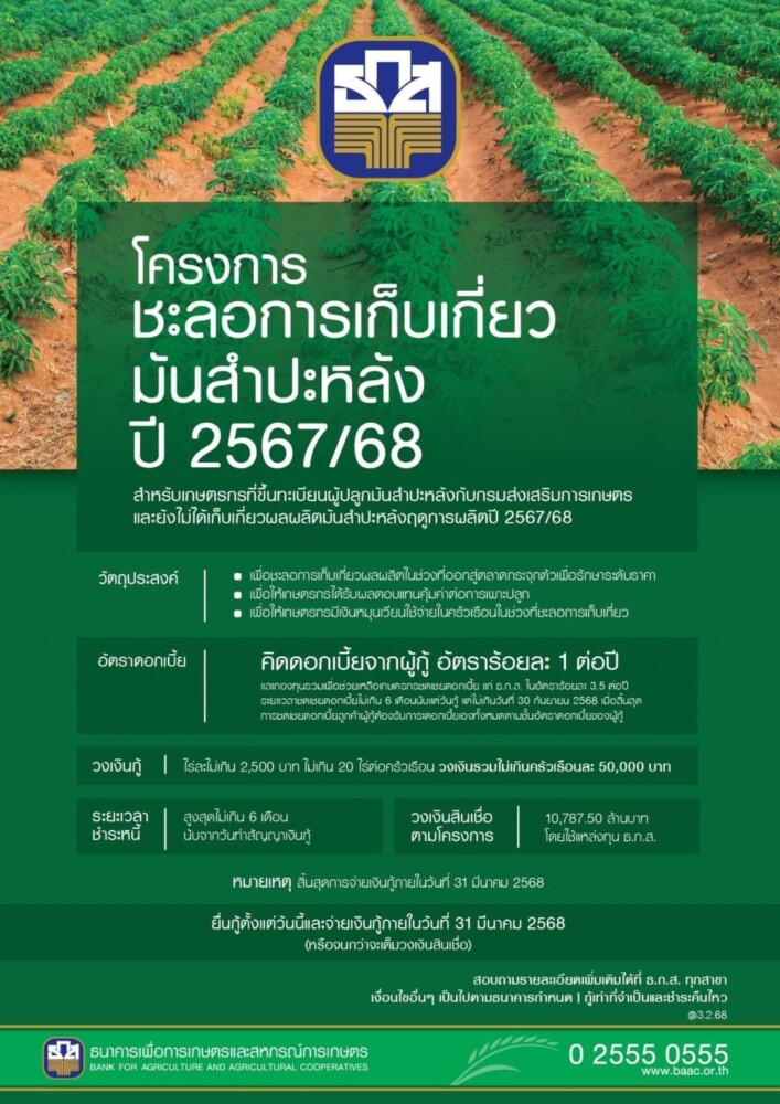 นายฉัตรชัย ศิริไล ผู้จัดการธนาคารเพื่อการเกษตรและสหกรณ์การเกษตร (ธ.ก.ส.) เปิดเผยว่า ที่ประชุมคณะกรรมการ ธ.ก.ส. เมื่อวันที่ 30 มกราคม 2568 ได้มีมติเห็นชอบให้ ธ.ก.ส. ดำเนินโครงการชะลอการเก็บเกี่ยวมันสำปะหลังปี 2567/68 ตามนโยบายรัฐบาล วงเงินสินเชื่อรวม 10,787.50 ล้านบาท เพื่อชะลอการเก็บเกี่ยวผลผลิตมันสำปะหลังเป็นระยะเวลา 6 เดือน ซึ่งถือเป็นช่วงที่ผลผลิตออกสู่ตลาดกระจุกตัว ส่งผลให้ราคามันสำปะหลังลดต่ำลงและไม่คุ้มค่ากับการเพาะปลูก โดยเกษตรกรสามารถนำเงินไปใช้เป็นเงินหมุนเวียนและค่าใช้จ่ายที่จำเป็นในครัวเรือนระหว่างรอการเก็บเกี่ยว