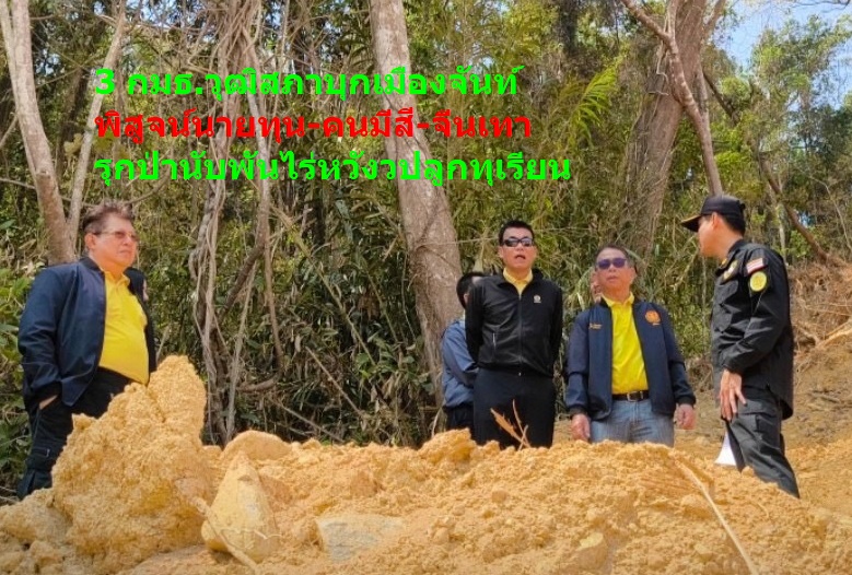 3 คณะกรรมาธิการ วุฒิสภา ยกทีมลงพื้นที่จันทบุรี ตรวจสอบพื้นที่ป่าสงวนแห่งชาติในพื้นที่อำเภอมะขามตามที่ชาวบ้านร้องเรีบยนมา หลังจากที่ชุดพยัคฆ์ไพรตรวจยึดตรวจพื้นที่เกือบ 1,800 ไร่ ในพื้นที่อำเภอแก่งหางแมว-เขาคิชฌกูฎ เผยมีเบาะแสว่าเป็นของนายทุนไทย-นายตำรวจในพื้นที่ ร่วมกับกลุ่มทุนจีนเทา บุกรุกเข้าไปเพื่อทำสวนทุเรียนแบบแปลงใหญ่