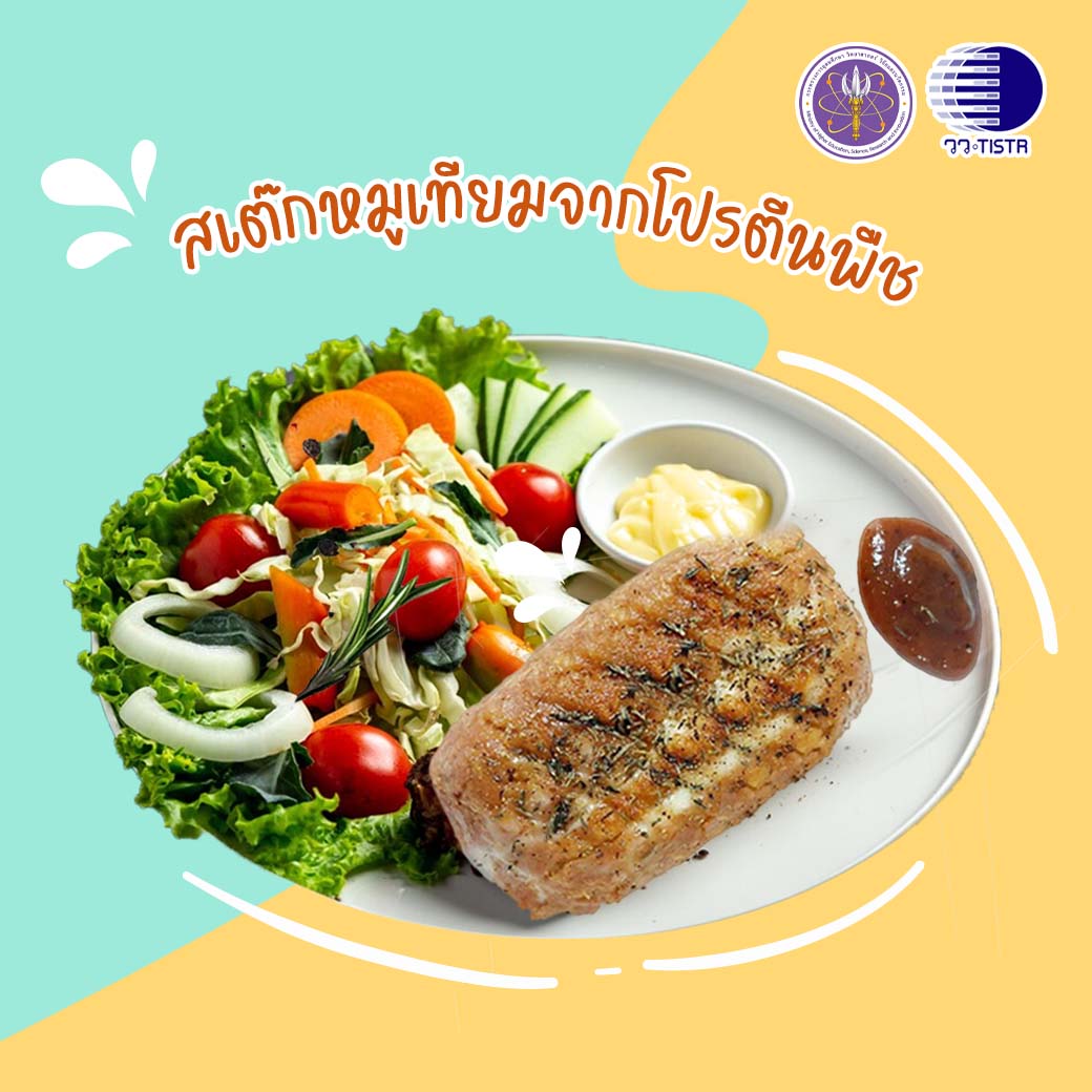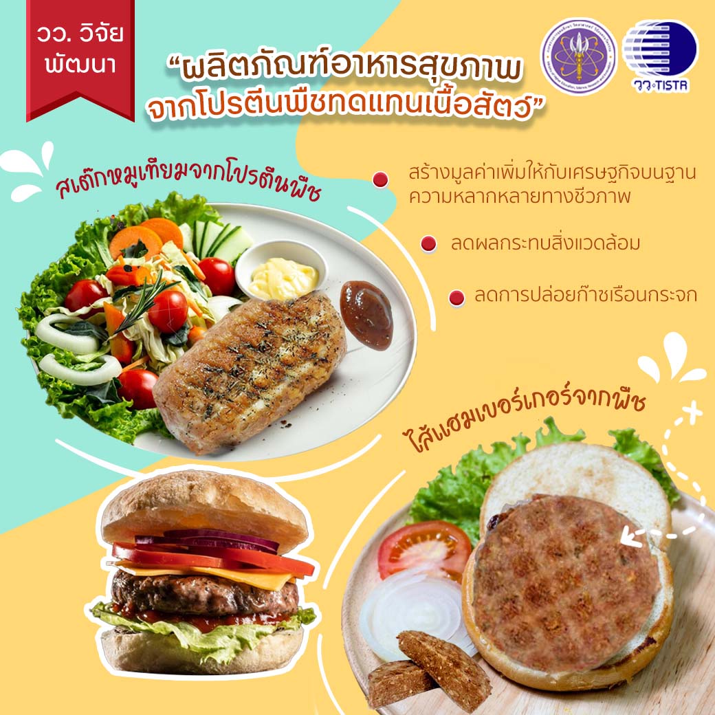 ศูนย์เชี่ยวชาญนวัตกรรมอาหารสุขภาพ สถาบันวิจัยวิทยาศาสตร์และเทคโนโลยีแห่งประเทศไทย ประสบผลสำเร็จงานวิจัยพัฒนาผลิตภัณฑ์อาหารสุขภาพจากโปรตีนพืช เพื่อทดแทนเนื้อสัต 4 เมนู ” สเต๊กหมูเทียม -ไส้แฮมเบอร์เกอร์จากพืชเสริมเห็ดแครง- ไส้แฮมเบอร์เกอร์จากพืชในระดับกึ่งอุตสาหกรรม-นักเก็ตจากโปรตีนถั่วแดงเข้มข้น” พร้อมถ่ายทอดเทคโนโลยีการผลิตสู่เชิงพาณิชย์ ตอบสนองความต้องการของผู้บริโภคและช่วยลดมลภาวะต่อสิ่งแวดล้อมที่เกิดขึ้นจากกระบวนการทางปศุสัตว์