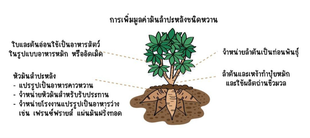 มันสำปะหลังชนิดหวาน (Sweet cassava) มีคุณค่าทางโภชนาการสูงปลอดภัยจากสารก่อมะเร็ง ทำเป็นขนมขบเคี้ยวทดแทนมันฝรั่งที่มีราคาสูงทำแป้งฟลาวไร้กลูเตน ทดแทนแป้งข้าวสาลี สถานีวิจัยลพบุรี มหาวิทยาลัยเกษตรศาสตร์ ได้พัฒนาสายพันธุ์มันสำปะหลังชนิดหวาน เพื่อเป็นทางเลือกส่งริมและสนับสนุนให้เกษตรกรผลิตเพื่อใช้ภายในประทศ แปรรูปเป็นผลิตภัณฑ์ที่มีคุณภาพ แก้ไขปัญหาการส่งออกในรูปของมันเส้นและ Native Starch ที่ลดลง