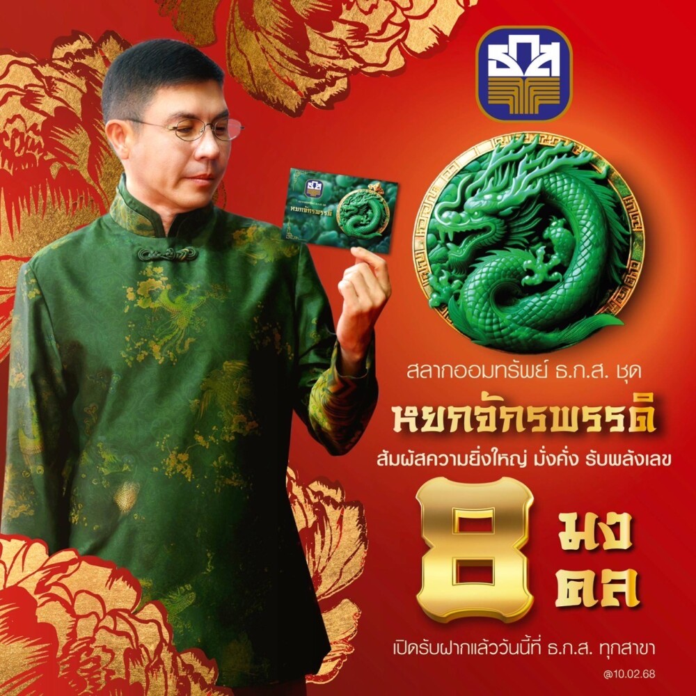 ธนาคารเพื่อการเกษตรและสหกรณ์การเกษตร (ธ.ก.ส.) เปิดเคาน์เตอร์การเงินกว่า 1,000 สาขาทั่วประเทศ ให้ลูกค้าที่รักการออมฝากเงินกับ สลากออมทรัพย์ ธ.ก.ส. ชุดหยกจักรพรรดิ หน่วยละ 10,000 บาท ตั้งแต่วันที่ 10 กุมภาพันธ์ 2568 เป็นต้นไป หลังจากที่เปิดรับฝากสลากชุดดังกล่าวที่มีเลขมงคลเริ่มต้นด้วยเลข “8” ทุกหน่วย ผ่านแอปพลิเคชัน BAAC Mobile ตั้งแต่วันที่ 20 มกราคมที่ผ่านมา และได้รับกระแสตอบรับเป็นอย่างดีโดยมียอดฝากรวมกว่า 7,000 ล้านบาท เมื่อฝากครบ 2 ปี รับผลตอบแทนหน่วยละ 280 บาท คิดเป็นอัตราดอกเบี้ยร้อยละ 1.40 ต่อปี (เทียบเท่าเงินฝากประจำร้อยละ 1.647 ต่อปี)