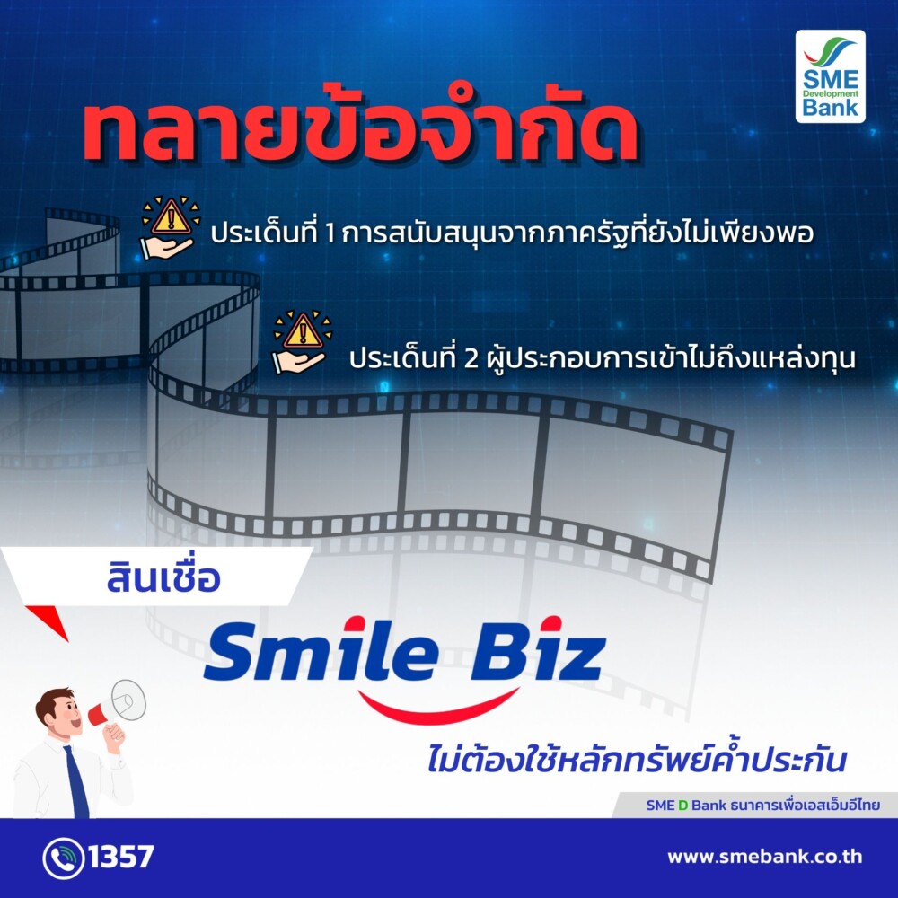 ด้วยผลิตภัณฑ์สินเชื่อ “Smile Biz ธุรกิจยิ้มได้” ไม่ต้องใช้หลักทรัพย์ค้ำประกัน บสย. ค้ำประกันเต็มจำนวน ดำเนินธุรกิจไม่น้อยกว่า 1 ปี สามารถกู้ได้และสามารถนับรวมประสบการณ์ผู้บริหารได้ อัตราดอกเบี้ยเริ่มต้น 6.4%ต่อปี ผ่อนชำระนานสูงสุด 7 ปี วงเงินสูงสุดไม่เกิน 5 ล้านบาทต่อราย นอกจากนี้ SME D Bank พร้อมเป็นแกนกลางในการเชื่อมโยงความต้องการและข้อเสนอของผู้ประกอบการไปยังหน่วยงานพันธมิตรที่เกี่ยวข้องทั้งภาครัฐและเอกชน เพื่อพัฒนา Ecosystem ของอุตสาหกรรมดิจิทัลคอนเทนต์ สร้างกลไกสำคัญขับเคลื่อนซอฟต์พาวเวอร์ไทยให้เติบโตต่อไป