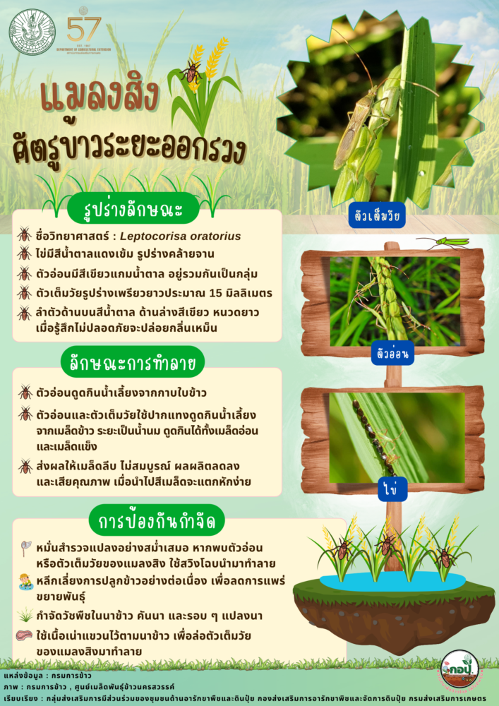 กรมส่งเสริมการเกษตร แจ้งเตือนเกษตรกรผู้ปลูกข้าว เฝ้าระวัง “แมลงสิง” แมลงศัตรูข้าวระยะออกรวง เนื่องจากพื้นที่ปลูกข้าวในประเทศเริ่มเข้าสู่ระยะออกรวงและเข้าสู่ระยะเก็บเกี่ยว ประมาณ 20 ล้านไร่ โดยข้อมูลจากระบบรายงานสถานการณ์ระบาดศัตรูพืชของพืชเศรษฐกิจหลักของกรมส่งเสริมการเกษตร ซึ่งเป็นระยะที่แมลงสิงจะเข้าทำลายในพื้นที่ปลูกข้าว จึงขอให้เกษตรกรหมั่นสำรวจแปลงนาของตนเองอย่างสม่ำเสมอ