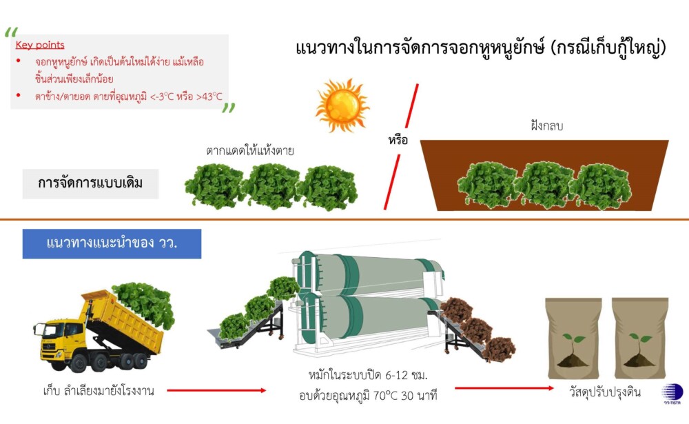 โอกาสนี้ ผู้ว่าการ วว. และคณะ นำเสนอ 2 แนวทางสำหรับการจัดการจอกหูหนูยักษ์ ดังนี้คือ 1.การนำมาเพิ่มมูลค่าด้วยเครื่องผลิตวัสดุหมักแบบเร่ง วว. ที่มีประสิทธิภาพในการเปลี่ยนวัสดุอินทรีย์เป็น “วัสดุปรับปรุงดิน” ได้ ภายใน 24 ชั่วโมง ซึ่งเครื่องต้นแบบตั้งอยู่ที่จังหวัดนครราชสีมา และจังหวัดกำแพงเพชร,และ 2. นำจอกหูหนูยักษ์ผ่านกระบวนการนึ่งอบไอน้ำระดับชุมชน เพื่อทำให้ขยายพันธุ์ต่อได้ แล้วนำไปเพิ่มมูลค่าเป็น “ปุ๋ยอินทรีย์” ผ่านการหมักแบบเร่งหรือหมักร่วมกับวัสดุอื่น