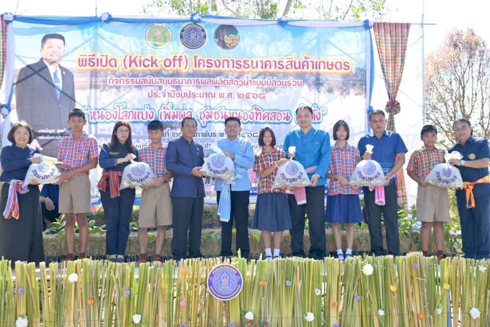 เมื่อวันที่ 27 กุมภาพันธ์ 2568 นายบัญชา สุขแก้ว อธิบดีกรมประมง เป็นประธานเปิดงาน Kick off ธนาคารผลผลิตสัตว์น้ำแบบมีส่วนร่วม “หนองโสกแบ่ง” จังหวัดมหาสารคาม โดยมี นางฐิติพร หลาวประเสริฐ รองอธิบดีกรมประมง ผู้บริหารหน่วยงาน และประชาชนในพื้นที่เข้าร่วมงาน เผยปี 2568 พร้อมขยายผลแหล่งน้ำใหม่อีก 20 แห่ง เสริมความเข้มแข็งให้ชุมชนในการบริหารจัดการแหล่งน้ำอย่างมีประสิทธิภาพและยั่งยืน สร้างความมั่นคงทางอาหาร ยกระดับคุณภาพชีวิตประชาชนในพื้นที่ให้อยู่ดี กินดี มีรายได้เพิ่มขึ้น สอดรับนโยบาย นายอัครา พรหมเผ่า รัฐมนตรีช่วยว่าการกระทรวงเกษตรและสหกรณ์