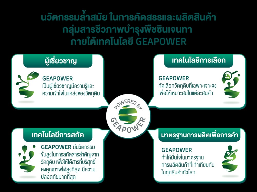 “เกียพาวเวอร์ (GEA POWER) ซึ่งเป็นเทคโนโลยีชีวภาพลิขสิทธิ์เฉพาะที่พัฒนาขึ้นเพื่อเสริมประสิทธิภาพของสารกระตุ้นทางชีวภาพ โดยใช้สารสกัดจากพืชธรรมชาติ ผ่านกระบวนการคัดเลือกและสกัดสารออกฤทธิ์ที่มีประโยชน์ต่อการเจริญเติบโตของพืช โดยใช้เทคโนโลยีล้ำสมัย อย่าง จีโนมิกส์ โปรตีโอมิกส์ และฟีโนมิกส์ เพื่อให้ได้โซลูชันที่เหมาะสมกับพืชแต่ละชนิดและแต่ละช่วงการเจริญเติบโต มีประสิทธิภาพและสร้างผลลัพธ์ที่ดีให้กับการเกษตรของไทย”