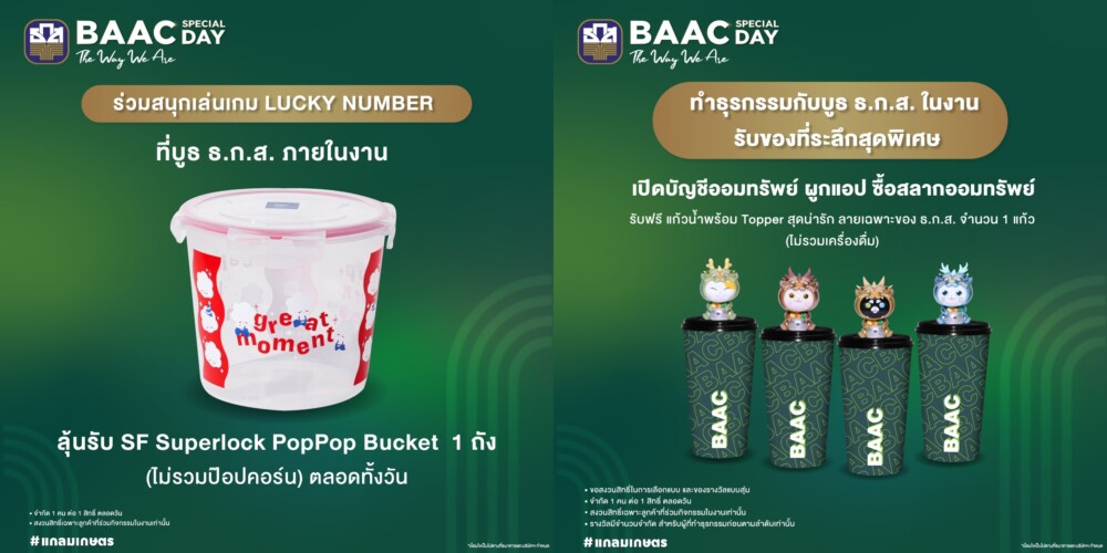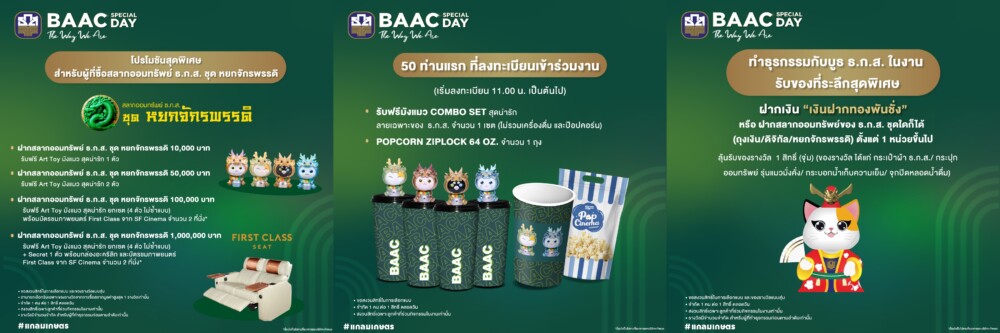 ธ.ก.ส. ชวนเปิดประสบการณ์แกลมเกษตรในงาน BAAC SPECIAL DAY : The Way We Are สร้างพลังขับเคลื่อนสินค้าเกษตรไทยที่มีเอกลักษณ์โดดเด่นไปสู่ตลาดผู้บริโภค พบกับสินค้าแกลมเกษตรมากมาย พร้อมโปรโมชันพิเศษเฉพาะในงานจาก ธ.ก.ส. สำหรับเงินฝากทองพันชั่งและสลากออมทรัพย์ ธ.ก.ส. ชุดหยกจักรพรรดิลุ้นรับสิทธิ์จุ่ม Art toy มังแมว ครบเซต นอกจากนี้ ยังมีกิจกรรม Meet and Talk Session จากศิลปินสุดพิเศษ ได้แก่ คุณออฟ จุมพล อดุลกิตติพร คุณกัน อรรถพันธ์ พูลสวัสดิ์ คุณสตางค์ กิตติภพ เสรีวิชยสวัสดิ์และคุณเต ตะวัน วิหครัตน์ และเกม Lucky draw ลุ้นรับของที่ระลึกมากมาย แล้วมาสัมผัสประสบการณ์สุดพิเศษไปกับ ธ.ก.ส. ได้ที่โรงภาพยนตร์ SF World Cinema ชั้น 7 เซ็นทรัลเวิลด์ วันที่ 1 มีนาคมนี้ ตั้งแต่เวลา 11.00 – 20.00 น.